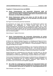LANDTAG NORDRHEIN-WESTFALEN - 17. Wahlperiode Drucksache 17/13566 Frageblock V: Förderung durch das Land (MWIDE) 45. Welche Förderprogramme zum kommunalen Klimaschutz stellte die Landesregierung mit welchen Fördersummen den Gemeinden und Kreisen in den Jahren von 2015 bis 2020 zur Verfügung? (Bitte absolut und jahresscharf für alle Gemeinden und Kreise NRWs aufschlüsseln.) 46. Welche Fördersummen wurden in den Jahren von 2015 bis 2020 von den bereitgestellten Geldern (laut Frage 45.) an die Gemeinden und Kreise aus dem Landeshaushalt ausgezahlt? Die Fragen 45 und 46 werden gemeinsam beantwortet. Die Beantwortung der Fragen sieht die Aufstellung der Fördersummen getrennt nach Auszahlungen und Bewilligungen vor. Dieses Schema lässt sich für die Massenförderprogramme Markteinführung und Emissionsarme Mobilität nicht in dieser Stringenz durchführen. Dies liegt daran, dass die Bewilligung der Mittel in vielen Fällen auch die Auszahlung der Mittel im gleichen Jahr nach sich zieht. Es wurde deshalb die Betrachtung gewählt, dass die Bewilligungen in einem Jahr, gemäß dem aktuellen Abrechnungsverfahren, auch als Auszahlung gelten. Siehe Anhang IV.: Tabelle VI.45 a) bis d) 47. Welche Fördermöglichkeiten des kommunalen Klimaschutzes mit welcher Fördersumme plant die Landesregierung den Gemeinden und Kreisen für das Jahr 2021 und darüber hinaus zur Verfügung zu stellen? Im Rahmen des „Nordrhein-Westfalen-Programms I zur Bewältigung der Folgen der Corona- Pandemie und zur Stärkung der Zukunftsfähigkeit des Landes“ wird die Landesregierung in den Jahren 2021 und 2022 kommunale Investitionen in Klimaschutzprojekte in Höhe von insgesamt 50 Millionen Euro fördern. Das operationelle Programm Nordrhein-Westfalen für die kommende Förderperiode des Europäischen Fonds für regionale Entwicklung (EFRE) 2021 – 2027 befindet sich derzeit in der Erarbeitung. Voraussichtlich werden in diesem Rahmen auch kommunale Antragssteller wieder die Möglichkeit haben, Förderungen im Bereich des Klimaschutzes zu beantragen. Aktuelle Planungen der Landesregierung für die Jahre 2021 und 2022 sehen vor, über das Förderprogramm „progres.nrw - Emissionsarme Mobilität“ elektrische Ladeinfrastruktur, batterieelektrische und Brennstoffzellen-Fahrzeuge mit jeweils 9 Millionen Euro zu fördern. Ferner ist eine Fortschreibung der Richtlinie progres.nrw Markteinführung in Abhängigkeit von der technischen Entwicklung sowie der weiterhin geltenden energiewirtschaftlichen und rechtlichen Rahmenbedingungen auch zukünftig vorgesehen. Diese Richtlinie ist grundsätzlich auch für Kommunen als Antragsteller zugelassen. 48. Wie schätzt die Landesregierung hinsichtlich des Kosten-Nutzen-Faktors den Nutzen der kommunalen Klimaschutz-maßnahmen im Verhältnis zu den bundes- und landesweiten Instrumenten zur Reduktion von Treibhausgasemissionen ein? Siehe Antworten zu den Fragen 11. und 14. 17