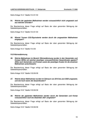 LANDTAG NORDRHEIN-WESTFALEN - 17. Wahlperiode Drucksache 17/13566 Siehe Anlage VI.A: Tabelle VI.A.51-54 54. Welche der geplanten Maßnahmen werden voraussichtlich nicht umgesetzt und aus welchen Gründen? Die Beantwortung dieser Frage erfolgt auf Basis der oben genannten Befragung der Gebietskörperschaften. Siehe Anlage VI.A: Tabelle VI.A.51-54 55. Wieviel Tonnen CO2-Äquivalente werden durch die umgesetzten Maßnahmen eingespart? Die Beantwortung dieser Frage erfolgt auf Basis der oben genannten Befragung der Gebietskörperschaften. Siehe Anlage VI.A: Tabelle VI.A.55 VI.B Wärmedämmung 56. Welche Maßnahmen im Bereich Wärmedämmung wurden in den Gemeinden und Kreisen NRWs mit welchen jeweiligen voraussichtlichen Gesamtkosten geplant? (Bitte nach Gemeinden und Kreisen sowie den jeweiligen Kosten für die einzelnen Maßnahmen aufschlüsseln) Die Beantwortung dieser Frage erfolgt auf Basis der oben genannten Befragung der Gebietskörperschaften. Siehe Anlage VI.B: Tabelle VI.B.56-59 57. Welche dieser Maßnahmen wurden im Zeitraum von 2015 bis Juni 2020 umgesetzt, und wie hoch waren die Gesamtkosten? Die Beantwortung dieser Frage erfolgt auf Basis der oben genannten Befragung der Gebietskörperschaften. Siehe Anlage VI.B: Tabelle VI.B.56-59 58. Welche der geplanten Maßnahmen werden durch die Gemeinden und Kreise voraussichtlich noch bis Dezember 2021 umgesetzt? Die Beantwortung dieser Frage erfolgt auf Basis der oben genannten Befragung der Gebietskörperschaften. Siehe Anlage VI.B: Tabelle VI.B.56-59 19