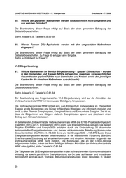 LANDTAG NORDRHEIN-WESTFALEN - 17. Wahlperiode Drucksache 17/13566 59. Welche der geplanten Maßnahmen werden voraussichtlich nicht umgesetzt und aus welchen Gründen? Die Beantwortung dieser Frage erfolgt auf Basis der oben genannten Befragung der Gebietskörperschaften. Siehe Anlage VI.B: Tabelle VI.B.56-59 60. Wieviel Tonnen CO2-Äquivalente werden mit den umgesetzten Maßnahmen eingespart? Die Beantwortung dieser Frage erfolgt auf Basis der oben genannten Befragung der Gebietskörperschaften. Zu Frage 60 erfolgte keine Eingabe. Siehe auch Antwort zu Frage 11. VI.C Bürgerberatung 61. Welche Maßnahmen im Bereich Bürgerberatung – speziell Klimaschutz – wurden in den Gemeinden und Kreisen NRWs mit welchen jeweiligen voraussichtlichen Gesamtkosten geplant? (Bitte nach Gemeinden und Kreisen sowie den jeweiligen Kosten für die einzelnen Maßnahmen aufschlüsseln) Die Beantwortung dieser Frage erfolgt auf Basis der oben genannten Befragung der Gebietskörperschaften. Siehe Anlage VI.C: Tabelle VI.C.61-64 Zur Beantwortung des Fragenbereiches VI.C Bürgerberatung wird auf die Aktivitäten der Verbraucherzentrale NRW mit kommunaler Beteiligung hingewiesen. Die Verbraucherzentrale NRW richtet sich zum Klimaschutz insbesondere im Themenfeld Energie an die Bürgerinnen und Bürger in Nordrhein-Westfalen und informiert, motiviert und berät zu den Themen Energiesparen, Energieeffizienz und Erneuerbare Energien. Ziel ist es, dass die Bürgerinnen und Bürgern dadurch Energiekosten sparen und gleichsam einen Beitrag zum Klimaschutz leisten. Im betreffenden Zeitraum hat die Verbraucherzentrale NRW drei EFRE-Projekte durchgeführt: ENeRWin (2015-2017), Energie2020 (2018-2020) und Energie2020plus (aktuell). Die beiden Projekte ENeRWin und Energie2020 erfolgten durch die Einbeziehung 28 dezentraler festangestellter Energieberaterinnen und -berater mit kommunaler Beteiligung (kommunaler Gesamtanteil bei ENeRWin: 4.178.333 Euro und bei Energie2020: 4.165.875 Euro). Diese Energieberatungsstellen wurden zwischenzeitlich in die institutionelle Förderung überführt. Eine finanzielle Zuordnung auf einzelne Kommunen und einzelne Aktivitäten ist gemäß der Verbraucherzentrale NRW nicht möglich. Die Kommunen, die an der Online-Abfrage teilgenommen haben, haben bei ihren Beiträgen teilweise Aktivitäten der Verbraucherzentrale NRW mitaufgeführt, siehe Tabelle VI.C.61-64. Die Tätigkeiten der 28 Energieberatungsstellen in den kofinanzierenden Kommunen sind sehr vielseitig, da sowohl persönliche Energieberatung vor Ort oder auf Messe- und Infoständen durchgeführt wird als auch Vorträge, Bildungsveranstaltungen sowie Aktivitäten in lokalen 20