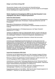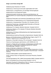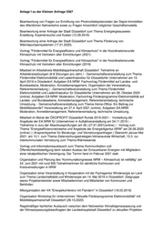 Anlage I zu der Kleinen Anfrage 5367 Initialberatung allg. Klimaschutz (31.10.2019) Initialberatung zur Sanierung der kommunalen Liegenschaften (20.01.2021) Initialberatungen zu energieeffizienten und nachhaltigen Nichtwohngebäuden Initialberatungen bei zwei Wasserkraft-Projekten Initialberatung bezüglich Anforderungen, Monitoring sowie Bewerbungs- und Nachweisverfahren zum Auszeichnungsprojekt „Energieeffiziente Nichtwohngebäude in NRW“. Initialberatung Fördermittel für die Krankenhaus-Zentralwäscherei des LVR (2019) Initialberatungen zur Projektentwicklung und zur Förderlandschaft Wasserstoff Initialberatung zu Ausbaupotentialen Photovoltaik. EVU, Düsseldorf (25.09.19) Initialberatung Finanzierungs- & Geschäftsmodelle Photovoltaik und Potenziale. Energieversorger. Düsseldorf (22.07.20) Initialberatung, PV im Gewerbe. öffentlicher Nahverkehr. Düsseldorf (22.02.21) Initialberatung, Weiteres zu PV im Gewerbe, PV-Potenzial. öffentlicher Nahverkehr. Düsseldorf (03.03.21) Initialberatung zu PV-Anlage auf Mehrparteienhaus einer Eigentümergemeinschaft, Düsseldorf | (26.04.21) Arbeitskreissitzung Auswirkung Photovoltaik auf Speicherthemen. Düsseldorf (06.03.19) Beratung und Informationsaustausch mit NRW MdL Rainer Deppe zu Agro-PV: PV- Freiflächen -Doppelnutzung mit Landwirtschaft (15.07.20) Arbeitskreis zu Photovoltaik Contracting, PPA und Dachpacht. Düsseldorf (24.05.19) Teilnahme an Expertengruppe Ladeinfrastruktur und EE, MWIDE (08.10.19) Austausch zu Floating Solar auf Grundwasser und Wasserpegel und Qualität; sowie Auswirkungen auf Bodenqualität und Bodenbeschaffenheit bei Freiflächen- Photovoltaikanlagen. Düsseldorf | (18.09.19) Vortrag und Diskussion zu Mieterstrom im Rahmen eines Forschungskolloquiums/Doktorandenseminars: „Nachhaltige Energiesystem im Quartier. Modelle und Strategien zwischen lokalen und globalen Herausforderungen“ in Düsseldorf (19.09.19) Vortrag PV+Elektromobilität, Lionsclub Düsseldorf (26.02.19) Vortrag, Teilnahme Podium am Regionalforum Kommunaler Klimaschutz, Düsseldorf (17.06.19) Informationsbereitstellung, EEG / ENWG Personenidentität. MWIDE. Düsseldorf (08.02.21) Besuch und Standbetreuung auf Energy Storage Düsseldorf (14.03.19) Organisation Pressetermin mit Ministertermin (Profl. Dr. Pinkwart) zur Einweihung der Klimaschutzsiedlung Düsseldorf-Lichtenbroich (8/2020).