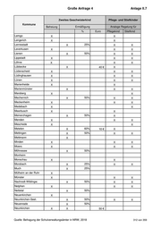 Große Anfrage 4 Anlage II.7 Zweites Geschwisterkind Pflege- und Stiefkinder Kommune Befreiung Ermäßigung Analoge Regelung für % Euro Pflegekind Stiefkind Hövelhof X X Höxter X X Hückelhoven X Hückeswagen X Hüllhorst X 25% X X Hünxe X X X Hürtgenwald X X Hürth X X Ibbenbüren X X X Inden X X X Iserlohn X X X Isselburg X k.A. k.A. Issum 50% Jüchen X X Jülich X X X Kaarst X X Kalkar X X X Kall 50% X X Kalletal X X Kamen X X X Kerken X 50% X X Kerpen X 50% X Kevelaer 50% X X Kierspe X k.A. k.A. X Kirchhundem X k.A. Kirchlengern X 50% X Kleve X 75% X Köln X X X Korschenbroich X 50% Kranenburg X Krefeld X X X Kreuzau X X 50% X Kreuztal X X X Kürten X X X Ladbergen X X Laer X Lage X X X Langenfeld X Langerwehe X 50% X X Legden X Quelle: Befragung der Schulverwaltungsämter in NRW, 2018 311 von 359