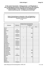 Große Anfrage 4 Anlage II.8 8: Wie werden Geschwister-, Stiefgeschwister- und Pflegekinder in einer Kindertageseinrichtung in den 396 Kommunen bei der Erhebung von Elternbeiträgen für den OGS-Besuch zum Beispiel durch Gebührenbefreiung oder –ermäßigung berücksichtigt? Tabelle 8: Berücksichtigung von Geschwister-, Stief- und Pflegekindern in Kindertageseinrichtungen bei der Erhebung von Elternbeiträgen für OGS – alphabetisch nach Kommune – n = 320 Beiträge Erstes Geschwisterkind Kommune Befreiung Ermäßigung % Euro Aachen x 50% Ahaus k.A. Aldenhoven k. Regelung Alfter k. Regelung Alsdorf x 100% Altena k. Regelung Altenbeken k. Regelung Altenberge x 50% Anröchte k. Regelung Arnsberg x Attendorn k. Regelung Augustdorf k. Regelung Bad Berleburg k. Regelung Bad Driburg k. Regelung Bad Honnef x Bad Lippspringe x Bad Münstereifel k. Regelung Bad Oeynhausen x 50% Bad Salzuflen x Bad Sassendorf x 50% Bad Wünnenberg k.A. Baesweiler k. Regelung Balve x 50% Barntrup x Beckum x Bedburg x Bedburg-Hau k. Regelung Quelle: Befragung der Schulverwaltungsämter in NRW, 2018 317 von 359