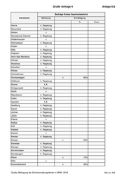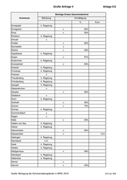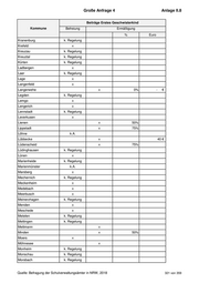 Große Anfrage 4 Anlage II.8 Beiträge Erstes Geschwisterkind Kommune Befreiung Ermäßigung % Euro Kranenburg k. Regelung Krefeld x Kreuzau k. Regelung Kreuztal k. Regelung Kürten k. Regelung Ladbergen x Laer k. Regelung Lage x Langenfeld x Langerwehe x 0% - € Legden k. Regelung Lemgo x Lengerich x Lennstadt k. Regelung Leverkusen x Lienen x 50% Lippstadt x 75% Löhne k.A. Lübbecke x 40 € Lüdenscheid x 75% Lüdinghausen k. Regelung Lünen x Marienheide k. Regelung Marienmünster k.A. Marsberg x Mechernich k. Regelung Meckenheim x Medebach x Meerbusch x Meinerzhagen k. Regelung Menden x Meschede x Metelen k. Regelung Mettingen k. Regelung Mettmann x Minden x 50% Moers x Möhnesee x Monheim k. Regelung Monschau k. Regelung Morsbach k. Regelung Quelle: Befragung der Schulverwaltungsämter in NRW, 2018 321 von 359