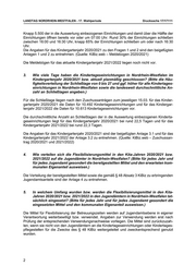 LANDTAG NORDRHEIN-WESTFALEN - 17. Wahlperiode Drucksache 17/17111 Knapp 5.500 der in die Auswertung einbezogenen Einrichtungen und damit über die Hälfte der Einrichtungen öffnen bereits vor oder um 07:00 Uhr. Rund 30% der Einrichtungen schließen zwischen 16:00 und 16:30 Uhr, knapp 65% der Einrichtungen schließen um oder nach 16:30 Uhr. Die Angaben für das Kindergartenjahr 2020/2021 zu den Fragen 1 und 2 sind den beigefügten Anlagen 1 und 2 zu entnehmen. (Quelle: KiBiz.web – Meldebogen 2020/2021) Die Meldebögen für das aktuelle Kindergartenjahr 2021/2022 liegen noch nicht vor. 3. Wie viele Tage haben die Kindertageseinrichtungen in Nordrhein-Westfalen im Kindergartenjahr 2020/2021 bzw. aktuell planmäßig geschlossen? (Bitte die Häu- figkeitsverteilung der Schließtage von 0 bis 27 und ggf. höher für alle Kindertages- einrichtungen in Nordrhein-Westfalen sowie die landesweit durchschnittliche An- zahl an Schließtagen angeben.) Für die Schließtage liegen nach den Zuschussanträgen zum jeweiligen 15.03. für das Kinder- gartenjahr 2020/2021 die Daten für 10.492 Kindertageseinrichtungen und für das Kindergar- tenjahr 2021/2022 die Daten für 10.613 Kindertageseinrichtungen vor. Die durchschnittliche Anzahl an Schließtagen der in die Auswertung einbezogenen Kinderta- geseinrichtungen liegt für das Kindergartenjahr 2020/2021 bei rund 22,5 Tagen und für das Kindergartenjahr 2021/2022 bei rund 22,3 Tagen. Die Angaben für das Kindergartenjahr 2020/2021 sind der beigefügten Anlage 3.1 und für das Kindergartenjahr 2021/2022 der Anlage 3.2 zu entnehmen. (Quelle: KiBiz.web – Zuschussan- trag 2020/2021 und 2021/2022) 4. Wie verteilen sich die Flexibilisierungsmittel in den Kita-Jahren 2020/2021 bzw. 2021/2022 auf die Jugendämter in Nordrhein-Westfalen? (Bitte für jedes Jahr und für jedes Jugendamt gesondert die bereitgestellten Mittel und den erwarteten kom- munalen Eigenanteil ausweisen.) Die Verteilung der bereitgestellten Mittel sowie die gemäß § 48 Absatz 3 KiBiz zu erbringenden Jugendamtsanteile sind der Anlage 4 zu entnehmen. 5. In welchem Umfang wurden bzw. werden die Flexibilisierungsmittel in den Kita- Jahren 2020/2021 bzw. 2021/2022 in den Jugendämtern in Nordrhein-Westfalen tat- sächlich eingesetzt? (Bitte für jedes Jahr und für jedes Jugendamt gesondert die eingesetzten Mittel und den kommunalen Eigenanteil ausweisen.) Die Mittel für Flexibilisierung der Betreuungszeiten werden auf Jugendamtsebene in eigener Verantwortung weiterbewilligt bzw. verwendet. Angaben zur Verwendung werden erst nach Prüfung der entsprechenden Verwendungsnachweise vorliegen. Die Mittel sind zurückzuzah- len, wenn sie nicht von den Jugendämtern an die Kindertageseinrichtungen oder Kindertages- pflegestellen für die Zwecke des § 48 KiBiz weitergeleitet und zweckentsprechend genutzt wurden. 2