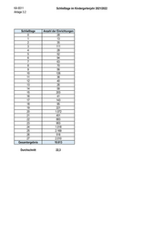 KA 6511 Schließtage im Kindergartenjahr 2021/2022 Anlage 3.2 Schließtage Anzahl der Einrichtungen 0 28 1 13 2 35 3 111 4 28 5 52 6 94 7 63 8 70 9 56 10 126 11 36 12 40 13 26 14 58 15 203 16 41 17 143 18 95 19 221 20 1.072 21 451 22 883 23 953 24 1.018 25 2.169 26 518 27 2.010 Gesamtergebnis 10.613 Durchschnitt 22,3