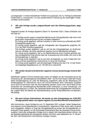 LANDTAG NORDRHEIN-WESTFALEN - 17. Wahlperiode Drucksache 17/15804 zurückgezogen. In einem beispiellosen Kraftakt ist es gelungen, die zur Verfügung stehenden Fördermittel zu vervierfachen, um eine auskömmliche Finanzierung der beantragten Förder- vorhaben sicherzustellen. 2. Wie viele Anträge wurden, aufgeschlüsselt nach den Ablehnungsgründen, abge- lehnt? Insgesamt wurden 35 Anträge abgelehnt (Stand 16. November 2021). Diese schlüsseln sich wie folgt auf: - 27 Anträge wurden wegen mangelnder Mitwirkung der Antragstellenden oder einer nicht gesicherten Gesamtfinanzierung des Vorhabens abgelehnt. - Ein Antrag wurde abgelehnt, weil die Investition in einer Kommune außerhalb des RWP- Fördergebiets geplant war. - Ein Antrag wurde abgelehnt, weil der Antragsteller dem Baugewerbe angehörte (Nr. 3.2.5 der RWP-Richtlinie gewerblich) - Drei Anträge wurden abgelehnt, weil es sich bei den Antragstellenden um Großunter- nehmen handelte, die keine signifikante negative Corona-Betroffenheit darlegten. - Ein Antrag wurde abgelehnt, weil er auf Markteinführung eines Produkts gerichtet war, das antragstellende Unternehmen aber die Voraussetzung nicht erfüllte, sich noch in der Gründungsphase zu befinden. - Ein Antrag wurde abgelehnt, weil es sich beim Antragsteller um einen Freiberufler han- delte (und kein gewerbliches Unternehmen im Sinne der Richtlinie). - Ein Antrag wurde abgelehnt, weil die beantragte Fördersumme die in Nr. 4.3 der Richtli- nie festgelegte Bagatellgrenze von 150.000 Euro unterschritt. 3. Wie werden die jetzt erforderlichen negativen Corona-Auswirkungen konkret defi- niert? Signifikante negative Corona-Auswirkungen waren von Beginn an die Voraussetzung für die Anwendung der „Bundesregelung Kleinbeihilfen 2020“. Die EU-Kommission hatte dem Erlass dieser Bundesregelung nur unter der Bedingung zugestimmt, dass sie der Abwendung von Schwierigkeiten für Unternehmen durch die Corona-Pandemie dient. Konkretere Vorgaben durch die EU-Kommission oder den Bund bestehen darüber hinaus nicht. Somit bleibt es den Anwendern der „Bundesregelung Kleinbeihilfen 2020“ überlassen, zu einer Verwaltungs- und Entscheidungspraxis zu finden, die individuelle Bedürfnisse der Antragstellenden berücksich- tigt, zugleich aber die Gebote der Gleichbehandlung und der Wirtschaftlichkeit und Sparsam- keit befolgt. 4. Bis wann können Unternehmen, die bereits vor dem Antragsstopp am 10.09.2021 Anträge gestellt haben, ihre eigene negative Corona-Betroffenheit konkretisieren? Alle Unternehmen, deren Anträge bis zum 10. September 2021 vorlagen, hatten Gelegenheit, ihre negative Corona-Betroffenheit zu konkretisieren. Allgemeine Fristen waren dafür zunächst nicht vorgegeben, lediglich im Zuge der Antragsbearbeitung wurden den Antragstellenden in- dividuelle Fristen gesetzt, um die rechtzeitige Entscheidung über den jeweiligen Antrag sicher- zustellen. Damit alle vorliegenden Anträge noch in diesem Jahr bearbeitet werden können, hat die Bewilligungsbehörde die Antragsteller darüber informiert, dass spätestens am 15. Novem- ber 2021 alle erforderlichen Informationen vorliegen müssen. 2