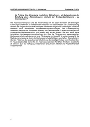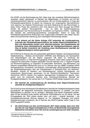 LANDTAG NORDRHEIN-WESTFALEN - 17. Wahlperiode Drucksache 17/16724 Der WVER und die Bezirksregierung Köln haben bzgl. des vorzeitigen Maßnahmenbeginns vereinbart, diesen gemeinsam im Rahmen der Möglichkeiten zu forcieren und mit den verfahrensrechtlichen Optionen zu synchronisieren. Bis zum Erörterungstermin im Zuge des Planfeststellungsverfahrens ist jedoch die Zulassung von vorgezogenen Baumaßnahmen nicht opportun, da mögliche Einwendungen und deren Bedeutung für das Planvorhaben in dieser frühen Phase des Verfahrens noch nicht bekannt sind. Nach Aussage des WVER werden die weiteren Planungsschritte ‐ hier vor allem die Ausführungsplanung (Leistungsphase 5 der Honorarordnung für Architekten und Ingenieure (HOAI)) ‐ unabhängig des Standes des Genehmigungsverfahrens vorangetrieben. Sofern im Zuge des Planfeststellungsverfahrens Änderungen bzw. Ergänzungen erforderlich sein sollten, können diese ohne gravierenden Zeitverzug auch nachträglich berücksichtigt werden. 3. In der Antwort auf die Kleine Anfrage 5767 antwortete die Landesregierung, innerhalb des Planfeststellungsverfahrens der beiden Regenrückhaltebecken in Rott und Mulartshütte würden auch Alternativvarianten, wie beispielsweise die Schaffung eines Rückhalteraums oberhalb der Dreilägerbachtalsperre geprüft. Was ist seither hinsichtlich der Schaffung eines Rückhalteraums oberhalb der Dreilägerbachtalsperre konkret geschehen? Der WVER hat im Rahmen des mit Landesmitteln geförderten Projektes „Hochwasserresiliente Stadtentwicklung – Stolberg und Eschweiler“ (HWRSE) unter Beteiligung von Fachexperten und Wissensträgern aus der Region insgesamt 196 Ideen zur Erhöhung der Hochwasserresilienz im Inde/Vicht‐Einzugsgebiet entwickelt. Diese Ideen wurden bereits zu insgesamt 62 potenziellen Projekten gebündelt. Darunter befinden sich 17 mögliche Projekte mit Renaturierungsbezug an insgesamt 23 potenziellen Standorten. Die Wirksamkeit und 4 Effizienz ausgewählter Maßnahmen wird nun im Rahmen des sog. BMBF ‐Projektes KAHR (Klimaanpassung, Hochwasser und Resilienz; Verbundprojekt „Wissenschaftliche Begleitung der Wiederaufbauprozesse nach der Flutkatastrophe in Rheinland-Pfalz und Nordrhein- Westfalen: Impulse für Resilienz und Klimaanpassung“) anhand hydrologischer und hydraulischer Berechnungen gemeinsam mit der Rheinisch-Westfälischen Technischen Hochschule (RWTH) Aachen und weiteren überregionalen Projektpartnern geprüft. Dazu gehört auch der potenzielle Standort einer Hochwasserrückhaltung oberhalb der 5 Dreilägerbachtalsperre. Die Laufzeit des F+E -Projektes KAHR beträgt insgesamt drei Jahre. 4. Wie bewertet die Landesregierung die Schaffung eines Regenrückhalteraums oberhalb der Dreilägerbachtalsperre? Die Errichtung eines Hochwasserrückhaltebeckens oberhalb der Dreilägerbachtalsperre bietet grundsätzlich die Möglichkeit technischen Wasserrückhalteraum zu schaffen und somit Abflussspitzen zu dämpfen und zu verzögern. Allerdings muss darauf hingewiesen werden, dass mit der Schaffung eines solchen technischen Rückhalteraums nur ein kleiner Teil des Einzugsgebiets der Vicht erfasst werden kann und somit – singulär betrachtet – die hochwasserreduzierende Wirkung begrenzt ist. Für belastbare Aussagen sind jedoch Detailbetrachtungen erforderlich, die im Rahmen des KAHR‐Projektes (siehe Frage 3) vom WVER ausgeführt werden. 5. Die Erkenntnisse aus dem Juli-Hochwasser 2021 haben gezeigt, dass auch über den Bau der zwei Regenrückhaltebecken in Rott und Mulartshütte hinausgehende Maßnahmen erforderlich sind. Wie wird die Landesregierung sich dafür einsetzen, 4 Bundesministerium für Bildung und Forschung 5 Forschung- und Entwicklung 3