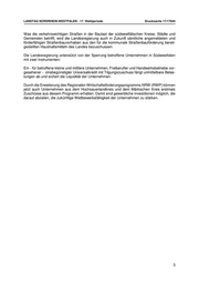 LANDTAG NORDRHEIN-WESTFALEN - 17. Wahlperiode Drucksache 17/17044 Was die verkehrswichtigen Straßen in der Baulast der südwestfälischen Kreise, Städte und Gemeinden betrifft, wird die Landesregierung auch in Zukunft sämtliche angemeldeten und förderfähigen Straßenbauvorhaben aus den für die kommunale Straßenbauförderung bereit- gestellten Haushaltsmitteln des Landes bezuschussen. Die Landesregierung unterstützt von der Sperrung betroffene Unternehmen in Südwestfalen mit zwei Instrumenten: Ein - für betroffene kleine und mittlere Unternehmen, Freiberufler und Handwerksbetriebe vor- gesehener - zinsbegünstigter Universalkredit mit Tilgungszuschuss fängt unmittelbare Belas- tungen ab und sichert die Liquidität der Unternehmen. Durch die Erweiterung des Regionalen Wirtschaftsförderungsprogramms NRW (RWP) können jetzt auch Unternehmen aus dem Hochsauerlandkreis und dem Märkischen Kreis erstmals Zuschüsse aus diesem Programm erhalten. Damit sind gewerbliche Investitionen möglich, die darauf abzielen, die zukünftige Wettbewerbsfähigkeit der Unternehmen zu stärken. 3