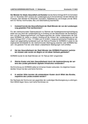 LANDTAG NORDRHEIN-WESTFALEN - 17. Wahlperiode Drucksache 17/15623 Der Minister für Arbeit, Gesundheit und Soziales hat die Kleine Anfrage 6070 mit Schreiben vom 12. November 2021 namens der Landesregierung im Einvernehmen mit dem Minister der Finanzen, dem Minister für Wirtschaft, Innovation, Digitalisierung und Energie und der Minis- terin für Heimat, Kommunales, Bau und Gleichstellung beantwortet. 1. Inwieweit konnte das Gesundheitsamt der Stadt Münster der von der Landesregie- rung gesetzten Frist nachkommen? Für den interkommunalen Datenaustausch im Rahmen der Kontaktpersonennachverfolgung bietet sich aus Sicht der Landesregierung im Einklang mit den Beschlüssen der Bundeskanz- lerin und der Regierungschefinnen und Regierungschefs der Länder insbesondere die Soft- ware SORMAS an (siehe zu diesem Hintergrund die Antwort der Landesregierung auf die Kleine Anfrage 5727, LT-Drs. 17/14964 vom 31.8.2021). Aufgrund technischer Probleme ver- zögert sich gegenwärtig bundesweit auch der Roll-out-Prozess für SORMAS-X sowie für die ergänzende Schnittstelle für die interkommunale Übertragung zwischen zwei SORMAS-Nut- zern. Die gesetzte Frist war unter diesen unabsehbaren Bedingungen nicht erfüllbar. 2. Hat das Gesundheitsamt der Stadt Münster das SORMAS-Programm nachrüs- ten müssen oder wurde von Beginn an mit dieser Software gearbeitet? SORMAS wurde für die Stadt Münster am 18. Februar 2021 eingerichtet. 3. Welche Kosten sind dem Gesundheitsamt durch die Implementierung der sei- tens des Landes geforderten digitalen Infrastruktur entstanden? Die Einrichtung von SORMAS selbst ist mit keinen Kosten verbunden. Zu möglichen Kosten darüber hinaus hat das Land keine Kenntnis. 4. In welcher Höhe konnten die entstandenen Kosten durch Mittel des Bundes, respektive des Landes erstattet werden? Der Nachweis der Kommunen war gegenüber der zuständigen Bezirksregierung zu erbringen. Dem MAGS liegen hierzu noch keine Kenntnisse vor. 2