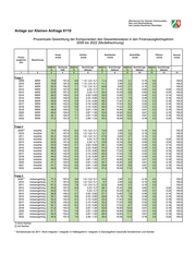 Anlage zur Kleinen Anfrage 6110 Prozentuale Gewichtung der Komponenten des Gesamtansatzes in den Finanzausgleichsjahren 2009 bis 2022 (Modellrechnung) Haupt- Schüler- Soziallasten- Zentralitäts- Flächen- Gesamt- Finanz- ansatz ansatz ansatz ansatz ansatz ansatz ausgleichs- Bezeichnung jahr Anteil in Spreizung Anteil in Gewichtungs- Anteil in Gewichtungs- Anteil in Gewichtungs- Anteil in Gewichtungs- % HAS % faktoren % faktoren % faktoren % faktoren 1 2 3 4 5 6 7 8 9 10 11 12 13 Frage 1 2009 NRW 76,6 157,0 8,8 * 1,5 / 3,0 / 5,1 11,4 3,90 3,1 0,15 0,0 - 100,0 2010 NRW 76,9 157,0 8,8 * 1,5 / 3,0 / 5,1 11,1 3,90 3,2 0,15 0,0 - 100,0 2011 NRW 65,4 154,0 7,1 * 1,5 / 3,0 / 5,1 24,8 9,60 2,7 0,15 0,0 - 100,0 2012 NRW 52,5 157,0 6,5 3,33 / 0,7 31,1 15,30 9,5 0,65 0,4 0,24 100,0 2013 NRW 52,8 157,0 6,7 3,33 / 0,7 30,4 15,30 9,8 0,65 0,4 0,24 100,0 2014 NRW 56,2 148,0 5,4 2,02 / 0,62 30,5 13,85 7,7 0,46 0,2 0,14 100,0 2015 NRW 52,6 148,0 6,2 2,23 / 0,85 33,3 15,76 7,6 0,48 0,3 0,18 100,0 2016 NRW 49,5 142,0 5,9 2,15 / 0,85 36,2 17,63 8,1 0,52 0,3 0,18 100,0 2017 NRW 49,5 142,0 5,8 2,15 / 0,85 36,2 17,63 8,2 0,52 0,3 0,18 100,0 2018 NRW 49,1 142,0 5,9 2,15 / 0,85 36,4 17,63 8,3 0,52 0,3 0,18 100,0 2019 NRW 48,8 154,0 7,0 2,67 / 1,00 34,1 16,80 9,9 0,61 0,3 0,19 100,0 2020 NRW 49,4 154,0 7,1 2,67 / 1,00 33,0 16,80 10,2 0,61 0,3 0,19 100,0 2021 NRW 50,1 154,0 7,1 2,67 / 1,00 32,0 16,80 10,5 0,61 0,3 0,19 100,0 2022 NRW 47,2 157,0 7,1 2,90 / 1,03 33,3 18,56 12,2 0,76 0,3 0,20 100,0 Frage 2 1) 2009 kreisfrei 75,9 157,0 8,0 1,5 / 3,0 / 5,1 13,0 3,90 3,1 0,15 0,0 - 100,0 2010 kreisfrei 76,1 157,0 8,0 1,5 / 3,0 / 5,1 12,7 3,90 3,2 0,15 0,0 - 100,0 2011 kreisfrei 63,3 154,0 6,5 1,5 / 3,0 / 5,1 27,6 9,60 2,7 0,15 0,0 - 100,0 2012 kreisfrei 50,5 157,0 6,0 3,33 / 0,7 34,3 15,30 9,1 0,65 0,0 0,24 100,0 2013 kreisfrei 50,8 157,0 6,2 3,33 / 0,7 33,6 15,30 9,4 0,65 0,0 0,24 100,0 2014 kreisfrei 53,5 148,0 5,1 2,02 / 0,62 34,1 13,85 7,4 0,46 0,0 0,14 100,0 2015 kreisfrei 49,9 148,0 5,9 2,23 / 0,85 37,0 15,76 7,3 0,48 0,0 0,18 100,0 2016 kreisfrei 46,5 142,0 5,5 2,15 / 0,85 40,2 17,63 7,8 0,52 0,0 0,18 100,0 2017 kreisfrei 46,3 142,0 5,5 2,15 / 0,85 40,4 17,63 7,8 0,52 0,0 0,18 100,0 2018 kreisfrei 46,0 142,0 5,5 2,15 / 0,85 40,7 17,63 7,9 0,52 0,0 0,18 100,0 2019 kreisfrei 46,5 154,0 6,5 2,67 / 1,00 37,7 16,80 9,3 0,61 0,0 0,19 100,0 2020 kreisfrei 47,1 154,0 6,6 2,67 / 1,00 36,7 16,80 9,6 0,61 0,0 0,19 100,0 2021 kreisfrei 47,7 154,0 6,6 2,67 / 1,00 35,8 16,80 9,9 0,61 0,0 0,19 100,0 2022 kreisfrei 44,9 157,0 6,5 2,90 / 1,03 37,2 18,56 11,5 0,76 0,0 0,20 100,0 Frage 3 2) 2009 kreisangehörig 77,3 157,0 9,6 1,5 / 3,0 / 5,1 10,0 3,90 3,1 0,15 0,0 - 100,0 2010 kreisangehörig 77,7 157,0 9,4 1,5 / 3,0 / 5,1 9,7 3,90 3,2 0,15 0,0 - 100,0 2011 kreisangehörig 67,3 154,0 7,8 1,5 / 3,0 / 5,1 22,2 9,60 2,7 0,15 0,0 - 100,0 2012 kreisangehörig 54,5 157,0 6,9 3,33 / 0,7 28,1 15,30 9,8 0,65 0,7 0,24 100,0 2013 kreisangehörig 54,8 157,0 7,1 3,33 / 0,7 27,2 15,30 10,1 0,65 0,7 0,24 100,0 2014 kreisangehörig 58,8 148,0 5,7 2,02 / 0,62 27,1 13,85 7,9 0,46 0,5 0,14 100,0 2015 kreisangehörig 55,1 148,0 6,6 2,23 / 0,85 29,9 15,76 7,9 0,48 0,6 0,18 100,0 2016 kreisangehörig 52,4 142,0 6,3 2,15 / 0,85 32,3 17,63 8,5 0,52 0,5 0,18 100,0 2017 kreisangehörig 52,5 142,0 6,2 2,15 / 0,85 32,2 17,63 8,6 0,52 0,5 0,18 100,0 2018 kreisangehörig 52,1 142,0 6,2 2,15 / 0,85 32,4 17,63 8,7 0,52 0,5 0,18 100,0 2019 kreisangehörig 51,0 154,0 7,5 2,67 / 1,00 30,6 16,80 10,4 0,61 0,5 0,19 100,0 2020 kreisangehörig 51,7 154,0 7,6 2,67 / 1,00 29,4 16,80 10,8 0,61 0,6 0,19 100,0 2021 kreisangehörig 52,4 154,0 7,6 2,67 / 1,00 28,4 16,80 11,1 0,61 0,6 0,19 100,0 2022 kreisangehörig 49,4 157,0 7,6 2,90 / 1,03 29,4 18,56 13,0 0,76 0,6 0,20 100,0 1) ohne Aachen 2) mit Aachen * Schüleransatz bis 2011: Nicht integrativ / integrativ in Halbtagsform / integrativ in Ganztagsform beschulte Schülerinnen und Schüler