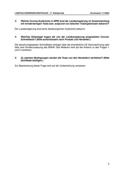 LANDTAG NORDRHEIN-WESTFALEN - 17. Wahlperiode Drucksache 17/16865 3. Welche Corona-Ausbrüche in NRW sind der Landesregierung im Zusammenhang mit minderwertigen Tests bzw. aufgrund von falschen Testergebnissen bekannt? Der Landesregierung sind keine diesbezüglichen Ausbrüche bekannt. 4. Welches Gütesiegel tragen die von der Landesregierung eingesetzten Corona- Schnelltests? (Bitte aufschlüsseln nach Produkt und Hersteller.) Die aktuell eingesetzten Schnelltests verfügen über die erforderliche CE-Kennzeichnung oder über eine Sonderzulassung des BfArM. Des Weiteren wird auf die Antwort zu den Fragen 1 und 2 verwiesen. 5. Zu welchen Bedingungen werden die Tests von den Herstellern zertifiziert? (Bitte Zertifikate beifügen.) Zur Beantwortung dieser Frage wird auf die Vorbemerkung verwiesen. 3