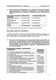 LANDTAG NORDRHEIN-WESTFALEN - 17. Wahlperiode Drucksache 17/17123 2. Wie hoch waren die Haushaltsmittel, die im Jahr 2021 für die unterschiedlichen Programmbereiche des Programms „progres.NRW“ zur Verfügung standen? (Bitte aufgeschlüsselt nach regulärem Landeshaushalt und Corona-Rettungs- schirm) Programme im Corona-Ret- Mittelverteilung Verausgabte Mittel in 2021 tungsschirm Emissionsarme Mobilität 65.000.000 EUR 17.850.000 EUR (progres.nrw) Klimaschutztechnik 162.000.000 EUR 39.700.000 EUR (progres.nrw) Kommunale Klimaschutz- 50.000.000 EUR 6.600.000 EUR projekte Gesamt: 277.000.000 EUR 64.150.000 EUR Zur Verfügung stehende Mittel für progres.nrw im regulären Landeshaushalt: Ansatz Kapitel 14 300 TG 63: 30.944.800 EUR Ansatz Kapitel 14 300 TG 69: 11.500.000 EUR Im Rahmen der flexiblen und effizienten Haushaltsmittelbewirtschaftung im Einzelplan 14 konnten weitere Mittel zur Verfügung gestellt werden und Corona-Konjunkturmittel gezielt für das Jahr 2022 entsprechend der Programm-Bedarfe eingesetzt werden. 3. Wie hoch war die Fördersumme, die über die Förderrichtlinie „progres.NRW – In- novation“ für die unterschiedlichen Themenbereiche abgerufen wurde in 2021? (Bitte einzelne Summen je Bereich unter 2.1 der Richtlinie über die Gewährung von Zuwendungen aus dem „Programm für rationelle Energieverwendung, rege- nerative Energien und Energiesparen - progres.nrw - Programmbereich Innova- tion“ getrennt angeben) Programmbereich Innovation – Themenbereiche Themenbereich Fördersumme (Auszahlung) 2.1 a) Abwärme, Abwasserwärme, Umweltwärme 244.654 EUR 2.1 b) Ausgleich fluktuierender erneuerbarer Einspeisungen 1.119.569 EUR in die Energienetze 2.1 c) Kopplung der Sektoren Strom, Wärme und Mobilität 0 EUR 2.1 d) Power to X Technologien 117.474 EUR 2.1 e) IT-Technologien zur Digitalisierung im Energiebereich 611.746 EUR 2.1 f) Brennstoffzellen- und Wasserstofftechnologien 2.498.811 EUR 2.1 g) Energieeffizienz und Reduzierung des Energieverbrauchs 448.991 EUR 2.1 h) Netztechnologien im Energiebereich 2.223.228 EUR 2.1 i) Ausbau und Steigerung der Nutzung Erneuerbarer 7.761.448 EUR Energien 2.1 j) Energieeffizienz Gebäude 508.857 EUR 2.1 k) klimagerechte Kraftstoffe und Antriebe der Zukunft 954.858 EUR 2.1 l) Kraft-Wärme-Kopplung, Kraft-Wärme-Kälte-Kopplung 385.835 EUR 2.1 m) Kraftwerkstechnologien und Energiebereitstellung 750.008 EUR 2.1 n) Speichertechnologien 1.791.938 EUR 2.1 o) Transformation der Energiesysteme 12.045 EUR 3