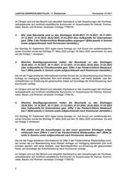 LANDTAG NORDRHEIN-WESTFALEN - 17. Wahlperiode Drucksache 17/17017 Im Übrigen wird auf den Bericht zum aktuellen Sachstand zu den Auswirkungen der Hochwas- serkatastrophe auf nordrhein-westfälische Kommunen im Ausschusses für Heimat, Kommu- nales, Bauen und Wohnen verwiesen (Vorlage 17/6619). 2. Wie viele Bescheide sind zu den Stichtagen 30.09.2021, 31.10.2021, 30.11.2021, 31.12.2021, 31.01.2022, 28.02.2022, 31.03.2022 über Aufbauhilfe für Unternehmen gem. Ziffer 3 der Förderrichtlinie Wiederaufbau ergangen? (Bitte jeweils in Summe sowie aufgeschlüsselt nach Kommunen darstellen.) Am Stichtag 30. September 2021 lagen keine Anträge vor. Auf Grund von verfahrenstechni- schen Gründen wurde der Stichtag 31. März 2022 auf den 18. März 2022 verschoben. Es wird auf die Anlage 1 verwiesen. 3. Welches Bewilligungsvolumen hatten die Bescheide zu den Stichtagen 30.09.2021, 31.10.2021, 30.11.2021, 31.12.2021, 31.01.2022, 28.02.2022, 31.03.2022 über Aufbauhilfe für Privathaushalte gem. Ziffer 4 der Förderrichtlinie Wiederauf- bau? (Bitte jeweils in Summe sowie aufgeschlüsselt nach Kommunen darstellen.) Die mit der Frage erbetenen Informationen konnten binnen der zur Beantwortung einer Kleinen Anfrage zur Verfügung stehenden Zeit nicht erhoben werden, weil keine Statistik- oder Be- richtspflichten zur Erhebung der gewünschten Daten auf Grundlage der Aufschlüsselung nach Kommunen vorliegt. Im Übrigen wird auf den Bericht zum aktuellen Sachstand zu den Auswirkungen der Hochwas- serkatastrophe auf nordrhein-westfälische Kommunen im Ausschusses für Heimat, Kommu- nales, Bauen und Wohnen verwiesen (Vorlage 17/6619). 4. Welches Bewilligungsvolumen hatten die Bescheide zu den Stichtagen 30.09.2021, 31.10.2021, 30.11.2021, 31.12.2021, 31.01.2022, 28.02.2022, 31.03.2022 über Aufbauhilfe für Unternehmen gem. Ziffer 3 der Förderrichtlinie Wiederauf- bau? (Bitte jeweils in Summe sowie aufgeschlüsselt nach Kommunen darstellen.) Am Stichtag 30. September 2021 lagen keine Anträge vor. Auf Grund von verfahrenstechni- schen Gründen wurde der Stichtag 31. März 2022 auf den 18. März 2022 verschoben. Es wird auf Anlage 2 verwiesen. 5. Wie stellen sich die Auszahlungen zu den zuvor genannten Stichtagen aufge- schlüsselt nach Ziffern 3 und 4 der Förderrichtlinie Wiederaufbau dar? (Bitte je- weils in Summe sowie aufgeschlüsselt nach Kommunen darstellen.) Die mit der Frage erbetenen Informationen für Ziffer 4 der Förderrichtlinie Wiederaufbau konn- ten binnen der zur Beantwortung einer Kleinen Anfrage zur Verfügung stehenden Zeit nicht erhoben werden, weil keine Statistik- oder Berichtspflichten zur Erhebung der gewünschten Daten auf Grundlage der Aufschlüsselung nach Kommunen vorliegt. Im Übrigen wird auf den Bericht zum aktuellen Sachstand zu den Auswirkungen der Hochwas- serkatastrophe auf nordrhein-westfälische Kommunen im Ausschusses für Heimat, Kommu- nales, Bauen und Wohnen verwiesen (Vorlage 17/6619). 2
