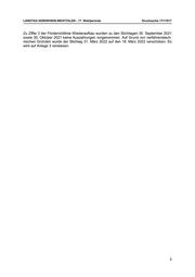 LANDTAG NORDRHEIN-WESTFALEN - 17. Wahlperiode Drucksache 17/17017 Zu Ziffer 3 der Förderrichtlinie Wiederaufbau wurden zu den Stichtagen 30. September 2021 sowie 30. Oktober 2021 keine Auszahlungen vorgenommen. Auf Grund von verfahrenstech- nischen Gründen wurde der Stichtag 31. März 2022 auf den 18. März 2022 verschoben. Es wird auf Anlage 3 verwiesen. 3