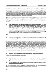 LANDTAG NORDRHEIN-WESTFALEN - 17. Wahlperiode Drucksache 17/16277 Um der Neuausrichtung des Programms und der damit verbundenen Stärkung der Schulsozi- alarbeit gerecht zu werden, wurden die jährlichen Landesmittel mit der Entscheidung über den Haushalt 2022 um 10 Millionen Euro auf 57,7 Millionen Euro erhöht. Aufgrund dessen kann die kommunale Schulsozialarbeit in Nordrhein-Westfalen gesichert fortgeführt und gleichzeitig über diese Sicherung hinaus gestärkt werden. Durch die Initiative der Landesregierung wurden somit Beschäftigungsverhältnisse für die Schulsozialarbeit im Rahmen von mindestens rd. 900 Vollzeitäquivalenten in kommunaler Verantwortung gesichert. Auf Initiative der Landesregierung steht der Bericht zum Thema Schulsozialarbeit seit dem 29. September 2021 auf der Tagesordnung des Ausschusses für Schule und Bildung. Der Tages- ordnungspunkt konnte aufgrund der Dringlichkeit anderer Themen bislang nicht aufgerufen werden. 1. In der Beantwortung der Kleinen Anfrage 4254, Landtags-Drucksache 17/11180, führt die Landesregierung am 29.09.2020 aus, das bisherige System neustruktu- rieren zu wollen. Ferner ist in der bereits erwähnten Presseinformation vom 24.09.2021 wie auch in der erwähnten Vorlage vom 28.09.2021 die Rede davon, dass an „der Fortführung der Konzeption … aller drei Säulen … intensiv weiterge- arbeitet“ werde. Gleichzeitig ist aber die Rede davon, dass die bestehenden Prob- leme nun dauerhaft gelöst seien. Ist die Neustrukturierung mit Veröffentlichung der Landtags-Vorlage 17/5796 angehängten Richtlinie abgeschlossen? Nein. 2. Falls nein: In welcher Form soll die Konzeption der Schulsozialarbeit in Zukunft angepasst werden? Mit der genannten Richtlinie hat das Land einen wichtigen weiteren Schritt in der Neuausrich- tung der Schulsozialarbeit vollzogen. Dieser folgt hierbei den zentralen Entscheidungen der Landesregierung, die lange Jahre bestehende Unsicherheit bei der Weiterfinanzierung der 47,7 Mio. Euro für Schulsozialarbeit zu beenden sowie gleichzeitig diese Mittel mit dem Haus- halt 2022 um zusätzliche 10 Mio. Euro zu erhöhen. An der Fortführung der Konzeption für Aufgaben und Zuständigkeiten der Schulsozialarbeit wird gleichwohl in gemeinsamer Verant- wortung des Ministeriums für Schule und Bildung und des Ministeriums für Kinder, Familie, Flüchtlinge und Integration mit den Beteiligten in Schule, Jugendhilfe, Schulaufsicht, Kommu- nen und Fachverbänden selbstverständlich intensiv weitergearbeitet. 3. Kann eine solche Anpassung Auswirkungen auf die Förderrichtlinie haben? Dies ist den weiteren Beratungen vorbehalten. 4. Welche Institutionen und Verbände waren an der Neufassung des Konzepts betei- ligt? 5. Wurden darüber hinaus Stellungnahmen von Akteuren eingeholt, die nicht am Be- ratungsprozess beteiligt waren? Zu den Fragen 4 und 5 wird auf die Antwort zu Frage 2 verwiesen. Die bisherig beteiligten Akteure werden selbstverständlich in das weitere Verfahren eingebunden. 2