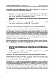 LANDTAG NORDRHEIN-WESTFALEN - 17. Wahlperiode Drucksache 17/17128 und der Abiturprüfung“ umzusetzen und Zeugnisse der Allgemeinen Hochschulreife gegensei- tig anzuerkennen, die dieser KMK-Vereinbarung entsprechen. Eine Änderung der Verordnung über den Bildungsgang und die Abiturprüfung in der gymnasi- alen Oberstufe (APO-GOSt) kann vor diesem Hintergrund erst im Nachgang nach Beschluss einer entsprechenden Neufassung der „Vereinbarung zur Gestaltung der gymnasialen Ober- stufe und der Abiturprüfung“ durch die KMK erfolgen. Vor dem Hintergrund des KMK-Beschlusses vom 15.10.2020 zu den Politischen Vorhaben zur „Ländervereinbarung über die gemeinsame Grundstruktur des Bildungswesens und die ge- samtstaatliche Verantwortung der Länder in zentralen bildungspolitischen Fragen“ dürften im Anschluss an die Anpassung der o.g. KMK-Vereinbarung umfangreichere Veränderungen der APO-GOSt erforderlich werden. Den ausstehenden Beschlüssen auf KMK-Ebene kann auf- grund ihrer Ergebnisoffenheit auf Landesebene nicht vorgegriffen werden. 3