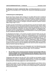 LANDTAG NORDRHEIN-WESTFALEN Drucksache 17/16134 17. Wahlperiode 28.12.2021 Antwort der Landesregierung auf die Kleine Anfrage 6178 vom 6. Dezember 2021 des Abgeordneten Norwich Rüße BÜNDNIS 90/DIE GRÜNEN Drucksache 17/15839 Wie steht es um die Umsetzung der Offensive für den Ökolandbau in Dortmund? Vorbemerkung der Kleinen Anfrage Beim ökologischen Landbau bleibt Nordrhein-Westfalen weit hinter den meisten anderen Bun- 1 desländern zurück. Auf ganz NRW gerechnet wirtschafteten 2020 lediglich 5,82 Prozent der Betriebe ökologisch und unterhielten an der gesamten landwirtschaftlich genutzten Fläche ei- 2 nen Anteil von 5,75 Prozent . Im September 2020 verkündete Landwirtschaftsministerin Hei- nen-Esser, dass bis zum Jahr 2030 der Anteil an ökologisch wirtschaftenden Betrieben auf 20 34 Prozent gesteigert werden solle. Da Nordrhein-Westfalen in seiner landwirtschaftlichen Struktur sehr heterogen ist, wird es auch bei der Umsetzung des 20-Prozent-Ziels unterschiedliche Startpunkte und Hindernisse je nach Stadt oder Kreis geben. So sind in den drei kürzlich ausgewählten Öko-Modellregionen Bergisches RheinLand, Kulturland Kreis Höxter und Niederrhein gute Entwicklungen möglich. Diese müssen aber auch tatsächlich Vorbild für andere Regionen in NRW sein, damit auch flächendeckend der Anteil an ökologisch wirtschaftenden landwirtschaftlichen Betrieben stei- gen wird. Ökologische Landwirtschaft ist sowohl für den Klimaschutz als auch für die Wirtschaft vor Ort besonders vorteilhaft, wenn es kleinteilige, regionale Verarbeitungs- und Vermarktungsstruk- turen gibt. Auch dieser Aspekt wird bei der Konzept-Umsetzung mitgedacht, wobei sich aber auch hierbei die Frage stellt, wie heterogen die Voraussetzungen in den einzelnen Kreisen und kreisfreien Städten des Landes sind. 1 https://www.sueddeutsche.de/wirtschaft/agrar-berlin-beim-oeko-landbau-hinkt-nordrhein-westfalen-hinterher- dpa.urn-newsml-dpa-com-20090101-200710-99-747714 2 https://www.it.nrw/statistik/eckdaten/landwirtschaftliche-betriebe-nach-groessenklassen-1481 3 https://www.umwelt.nrw.de/presse/detail/landwirtschaft-2030-eine-branche-mit-zukunft-fuer-nordrhein-westfa- len-1600770853 4 https://www.it.nrw/statistik/eckdaten/landwirtschaftliche-betriebe-mit-oekologischer-wirtschaftsweise-1484 Datum des Originals: 27.12.2021/Ausgegeben: 04.01.2022