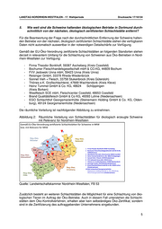 LANDTAG NORDRHEIN-WESTFALEN - 17. Wahlperiode Drucksache 17/16134 5. Wie weit sind die Schweine haltenden ökologischen Betriebe in Dortmund durch- schnittlich von der nächsten, ökologisch zertifizierten Schlachtstätte entfernt? Für die Beantwortung der Frage nach der durchschnittlichen Entfernung der Schweine halten- den Betriebe von der nächsten, ökologisch zertifizierten Schlachtstätte stehen die verfügbaren Daten nicht automatisch auswertbar in der notwendigen Detailschärfe zur Verfügung. Gemäß der EU-Öko-Verordnung zertifizierte Schlachtstätten an folgenden Standorten stehen derzeit in relevantem Umfang für die Schlachtung von Schweinen aus Öko-Betrieben in Nord- rhein-Westfalen zur Verfügung: - Firma Theodor Bonkhoff, 59387 Ascheberg (Kreis Coesfeld) - Bochumer Fleischhandelsgesellschaft mbH & CO.KG, 44809 Bochum - FVV Jedowski Unna mbH, 59423 Unna (Kreis Unna) - Reisinger GmbH, 33378 Rheda-Wiedenbrück - Sonnet Vieh + Fleisch, 33758 Stukenbrock (Kreis Gütersloh) - Thönes e.K. Großschlachterei, 47669 Wachtendonk (Kreis Kleve) - Heinz Tummel GmbH & Co. KG, 48624 Schöppingen (Kreis Borken) - Westfleisch SCE mbH, Fleischcenter Coesfeld, 48653 Coesfeld - Brand Qualitätsfleisch GmbH & Co KG, 49393 Lohne (Niedersachsen) - EGO Schlachthof Georgsmarienhütte (Steinemann Holding GmbH & Co. KG, Olden- burg), 49124 Georgsmarienhütte (Niedersachsen) - Die räumliche Verteilung ist nachfolgender Abbildung zu entnehmen. Abbildung 2: Räumliche Verteilung von Schlachtstätten für ökologisch erzeugte Schweine mit Relevanz für Nordrhein-Westfalen Quelle: Landwirtschaftskammer Nordrhein-Westfalen, FB 53 Zusätzlich besteht an weiteren Schlachtstätten die Möglichkeit für eine Schlachtung von öko- logischen Tieren im Auftrag der Öko-Betriebe. Auch in diesem Fall unterstehen die Schlacht- stätten dem Öko-Kontrollverfahren, erhalten aber kein selbständiges Öko-Zertifikat, sondern sind in die Zertifizierung des auftraggebenden Unternehmens eingebunden. 5