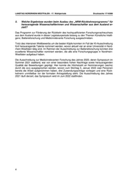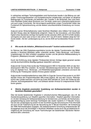 LANDTAG NORDRHEIN-WESTFALEN - 17. Wahlperiode Drucksache 17/16388 5. Welche Ergebnisse wurden beim Ausbau des „NRW-Rückkehrerprogramms“ für herausragende Wissenschaftlerinnen und Wissenschaftler aus dem Ausland er- zielt? Das Programm zur Förderung der Rückkehr des hochqualifizierten Forschungsnachwuchses aus dem Ausland wurde in dieser Legislaturperiode bislang zu den Themen Künstliche Intelli- genz, Batterieforschung und Medizinrelevante Forschung ausgeschrieben. Trotz des intensiven Wettbewerbs um die besten Köpfe konnten im Fall der KI-Ausschreibung fünf herausragende Talente nominiert werden, wovon aktuell vier an einer Universität in Nord- rhein-Westfalen tätig sind. Im Rahmen der Ausschreibung zur Batterieforschung konnten drei exzellente Wissenschaftler nominiert werden, die alle eine Forschungsgruppe in Nordrhein- Westfalen aufgebaut haben. Die Ausschreibung zur Medizinrelevanten Forschung des Jahres 2020, deren Symposium im Sommer 2021 stattfand, war von einer besonders hohen Nachfrage sowie herausragenden Qualität der Bewerbungen geprägt. Hier konnte die Höchstzahl an Nominierungen (sechs) durch die Jury ausgesprochen werden, wovon zum Stichtag 5. Januar 2022 zwei Personen bereits die Arbeit aufgenommen haben, drei Zuwendungsanträge vorliegen und eine Rück- kehrerin unmittelbar vor der formalen Antragstellung steht. Die Ausschreibung des Jahres 2021 läuft derzeit, das Symposium wird im Juni 2022 stattfinden. 4
