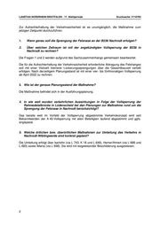 LANDTAG NORDRHEIN-WESTFALEN - 17. Wahlperiode Drucksache 17/16703 Zur Aufrechterhaltung der Verkehrssicherheit ist es unumgänglich, die Maßnahme zum jetzigen Zeitpunkt durchzuführen. 1. Wann genau soll die Sprengung der Felsnase an der B236 Nachrodt erfolgen? 2. Über welchen Zeitraum ist mit der angekündigten Vollsperrung der B236 in Nachrodt zu rechnen? Die Fragen 1 und 2 werden aufgrund des Sachzusammenhangs gemeinsam beantwortet. Die für die Aufrechterhaltung der Verkehrssicherheit erforderliche Abtragung des Felshanges soll mit einer Vielzahl kleinerer Lockerungssprengungen über die Gesamtbauzeit verteilt erfolgen. Nach derzeitigem Planungsstand ist mit einer vier- bis fünfmonatigen Vollsperrung ab April 2022 zu rechnen. 3. Wie ist der genaue Planungsstand der Maßnahme? Die Maßnahme befindet sich in der Ausführungsplanung. 4. In wie weit wurden verkehrlichen Auswirkungen in Folge der Vollsperrung der Rahmedetalbrücke in Lüdenscheid bei den Planungen zur Maßnahme rund um die Sprengung der Felsnase in Nachrodt berücksichtigt? Das bereits weit im Vorfeld der Vollsperrung abgestimmte Verkehrskonzept wird seit Bekanntwerden der A 45-Vollsperrung mit allen Beteiligten laufend abgestimmt und ggfs. angepasst. 5. Welche örtlichen bzw. überörtlichen Maßnahmen zur Umleitung des Verkehrs in Nachrodt-Wiblingwerde sind konkret geplant? Die Umleitung erfolgt über Iserlohn (via L 743, K 18 und L 648), Hemer/Ihmert (via L 888 und L 683) sowie Altena (via L 698). Sie wird mit wegweisender Beschilderung ausgewiesen. 2