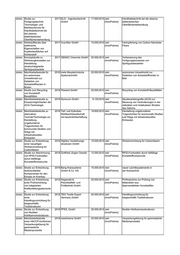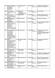 SMWA Durchführbarkeitsstudie 2016 UNITUBE 18.900,00 € nein Rohrinnendämpfungssystem zur Entwicklung eines TECHNOLOGY GmbH (InnoPrämie) Rohrinnendämpfungssys tems SMWA Machbarkeitsstudie zur 2016 Nomos 5.730,00 € nein Laserbearbeitung von Uhrenbändern Laserstrahlbearbeitung Glashütte/SARoland (InnoPrämie) von Edelstahlgeweben Schwertner KG für Uhrenbänder SMWA Markt- 2016 CPT Präzisionstechnik 20.000,00 € nein Verbesserung der Prozessabläufe /Durchführbarkeitsstudie GmbHChemnitz (InnoPrämie) zu innovativen Verfahrens-, Ablauf- und Arbeitsplatzkonzepten für hochpräzise Dreh- und Frästeile SMWA Studie zur Herstellung 2016 Köstler GmbH 9.000,00 € nein prinzipielle Machbarkeit wurde neuartiger (InnoPrämie) nachgewiesen, weitere FuE-Arbeiten Halbzeugmaterialien schlossen sich an SMWA Machbarkeitsstudie zur 2016 Wilhelm Kimmel GmbH & 20.000,00 € nein Kunststoffe mit antibakterieller Entwicklung Co.KG Kunststoffe (InnoPrämie) Wirkung basaltpulvergefüllter thermoplastischer Kunststoffe mit antibakterieller Wirkung und daraus hergestellter Bauteile SMWA Machbarkeitsstudie zur 2016 Ivonne Leon-Voigt 20.000,00 € nein Schlafsack mit Sensoren Integration von (InnoPrämie) Überwachungsmodulen in einen Babyschlafsack zur Prophylaxe des plötzlichen Säuglingstodes SMWA Technologiestudie zur 2016 TEG Textile Expert 20.000,00 € nein Kantensteuerung bei Nähprozessen Kantensteuerung bei Germany GmbH (InnoPrämie) Nähprozessen SMWA Konzeptstudie zur 2016 Hegewald & 10.000,00 € nein Scherrahmenprüfsystem zur Ermittlung von PeschkeMeß- und (InnoPrämie) Ermittlung von Umformeigenschaften Umformeigenschaften Prüftechnik GmbH mittels Scherrahmenprüfsystem SMWA Machbarkeitsstudie zur 2016 Modellbau Roth GmbH & 20.000,00 € nein crashrelevante bionische Entwicklung einer Co.KG (InnoPrämie) Leichtbaukarosserie crashrelevanten bionischen Leichtbaukarosserie SMWA Machbarkeitsstudie: 2016 TESOMA GmbH 20.000,00 € nein Nutzung von Abwärme für die Abbildung eines (InnoPrämie) thermische Trocknung biogener Stoffe geeigneten Konzeptes zur Nutzung von Abwärme für die thermische Trocknung biogener Stoffe SMWA Machbarkeitsstudie zur 2016 HYPNEU 20.000,00 € nein mobile Hochdruckanlage Abbildung eines mobilen GmbHHydraulik und (InnoPrämie) Hochdruckhydraulik Pneumatik Aggregats SMWA Durchführbarkeitsstudie 2016 AIS Agrar - Innovation - 11.000,00 € nein Düngerstreuer zum Aufbau eines Service GmbH (InnoPrämie) universellen Düngerstreuers "Uni- Streu-Trac" SMWA Machbarkeitsstudie zur 2016 Bader Glastechnologie 10.000,00 € nein Teilautomatisierung im Prozess des Automatisierung der GmbH (InnoPrämie) Glas-Edelstahlklebens Glas-Edelstahl- von Backofensichttüren Verklebung von Sichttüren für Backöfen