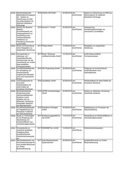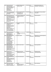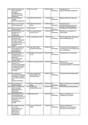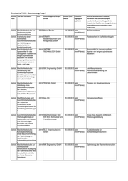 SMWA Machbarkeitsstudie: 2016 AXXELLON GmbH 20.000,00 € nein System zur Abrechnung von kWh aus Batterieabrechnungssyst (InnoPrämie) Akkumulatoren für elektrisch em - System zur betriebene Fahrzeuge Abrechnung von kWh aus Akkumulatoren für elektrisch betriebene Fahrzeuge SMWA Studien der Bereiche 2016 Kontor3.11 GmbH 20.000,00 € nein Verbesserung Material, (InnoPrämie) Herstellungstechnologie von Durchführbarkeit und chemischen Leuchtstäben Fertigungstechnik zur Entwicklung eines vollautomatisierten Verfahrens zur Herstellung chemischer Leuchtstäbe SMWA Studie und Entwicklung 2017 Philipp Wetzel 12.500,00 € nein Glasgatters zur tangentialen eines Glasgatters zur (InnoPrämie) Abwicklung tangentialen Abwicklung SMWA Konzeptstudie zu 2017 Brand, Werkzeug- 16.750,00 € nein endlos-faserverstärkte werkzeug- und undMaschinenbau GmbH (InnoPrämie) Formpressmassen materialspezifischen Anforderungen bei der Verarbeitung von endlos- faserverstärkten Formpressmassen SMWA Durchführbarkeitsstudie: 2016 IWC Engineering GmbH 20.000,00 € nein Fertigung von Innenhochdruck- Zur Herstellung von (InnoPrämie) Umformbauteilen ohne innenhochdruck- Hydraulikpresse umgeformten Bauteilen ohne eine hydraulische Presse SMWA Technologiestudie für 2016 autodeltass GmbH 20.000,00 € nein Wickelverfahren für dicke Drähte auf innovative (InnoPrämie) komplexen Strukturen Wickelverfahren für dicke Drähte auf komplexen Strukturen SMWA Machbarkeitsstudie 2016 ASTRA Industrieanlagen 20.000,00 € nein System zur effizienten Verwertung Anwendung eines GmbH (InnoPrämie) industrieller Abwärme wärmeverarbeitenden Systems in einer autarken Unit zur effizienten Verwertung industrieller Abwärme aus Brennkammern SMWA Durchführbarkeitsstudie 2016 Polartherm-Flachglas 20.000,00 € nein Digitalisierung von Prozessen der zur Digitalisierung von GmbH (InnoPrämie) Glasverarbeitung Prozessen im Bereich der Glasverarbeitung SMWA Studie zu Technologien 2017 EntstaubungsgerätePuls 14.810,00 € nein Abscheidung von Kohlenstofffasern in für die Erfassung und nitz GmbH (InnoPrämie) Verarbeitungsprozessen Abscheidung von Kohlenstofffasern aus Verarbeitungsprozessen SMWA Konzeptstudie zur 2017 NORDMETALL GmbH 10.000,00 € nein Drehmomentmesssystem numerisch gestützten (InnoPrämie) Auslegung eines hochdynamischen Drehmomentmesssyste ms SMWA Machbarkeitsstudie und 2017 meta Messtechnische 20.000,00 € nein portable Bohrsonde zur Online- Konstruktionskonzept für SystemeGmbH (InnoPrämie) Bodenluftmessung eine portable Bohrsonde zur Online- Bodenluftmessung