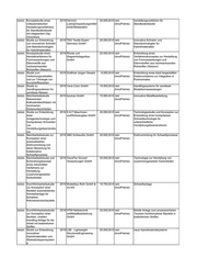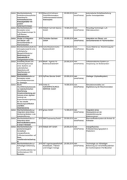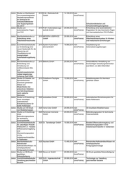 SMWA Machbarkeitsstudie zur 2018 Heinrich 20.000,00 € nein Automatisierung des Automatisierung des LudwigVerpackungsmittel (InnoPrämie) Herstellungsprozesses von Flach-, Herstellungsprozesses GmbHSiebenlehn Falten- und Bodenbeuteln von Flach-, Falten- und Bodenbeuteln SMWA Machbarkeitsstudie zur 2018 authentic.network GmbH 9.961,00 € nein Implementierung der authentic- Implementierung der (InnoPrämie) Technologie in Textillabels authentic-Technologie in Textillabels SMWA Machbarkeitsstudie für 2018 authentic.network GmbH 9.800,00 € nein Token Economy Simulationstool ein Token Economy (InnoPrämie) Simulationstool SMWA Studie zur Entwicklung 2018 PolymerPark materials 20.000,00 € nein optische Prüfvorrichtung einer optischen GmbH (InnoPrämie) Prüfvorrichtung SMWA Machbarkeitsstudie für 2018 OecoPac Grunert 10.000,00 € nein 3-D-Konturen-Schnittverfahren mittels ein 3-D-Konturen- Verpackungen GmbH (InnoPrämie) Wasserstrahl-Schneidtechnologie Schnittverfahren für Papphülsen mittels Wasserstrahl- Schneidtechnologie SMWA Studie 2018 Polartherm-Flachglas 19.937,00 € nein Schnelltestverfahren für Schnelltestverfahren GmbH (InnoPrämie) Digitaldruckbeschichtungen auf Digitaldruckbeschichtun beschichtetem Floatglas gen auf beschichtetem Floatglas SMWA Studie zur Entwicklung 2018 SCHMIETEX 20.000,00 € nein Anlagentechnologie zur Z- einer ENGINEERING GmbH (InnoPrämie) Verstärkung von Hybridmaterialien Anlagentechnologie zur Z-Verstärkung von Hybridmaterialien SMWA Machbarkeitsstudie und 2018 Formicum 3D-Service 10.000,00 € nein Auslöse-Systems für die synchrone Entwicklung eines GmbH (InnoPrämie) Auslösung von WLAN-Kameras für verbesserten Auslöse- das Scanner-System Moduscan Systems für die synchrone Auslösung von WLAN-Kameras für das Scanner-System Moduscan SMWA Read-Performance- 2018 ITC Internet-Trade- 4.500,00 € nein Softwarelösung als Alternative zur Studie als Alternative zu CenterAG (InnoPrämie) MySQL-Datenbank MySQL-Datenbank SMWA Machbarkeitsstudie zur 2018 DachdeckermeisterClaus 5.457,00 € nein Robotik bei Dachdeckerarbeiten Automatisierung von Dittrich GmbH & Co. KG (InnoPrämie) Dachdeckertätigkeiten SMWA Studie zur Machbarkeit 2018 fömat GmbH 20.000,00 € nein faserverstärkte Halbzeuge zum von faserverstärkten Fördertechnikund (InnoPrämie) Einsatz in Becherwerksketten Halbzeugen zum Einsatz Maschinenbau in Becherwerksketten SMWA Durchführbarkeitsstudie 2018 Neustädter 9.987,50 € nein Funktionsunterhemd mit Sensorik zur Produktentwicklung - Gardinenkonfektion (InnoPrämie) Funktionsunterhemd mit GmbH Sensorik SMWA Machbarkeitsstudie für 2018 Bautischlerei Köhler 20.000,00 € nein Automatisierung der eine intelligente und GmbH (InnoPrämie) Produktionsprozesse integrierende Auftragsplanung und - bearbeitung SMWA LeiWa - 2018 Betonwerk Schuster 20.000,00 € nein gewichtsreduzierte Wandelemente Machbarkeitsstudie zur GmbH (InnoPrämie) technisch- technologischen Umsetzung von stahlfrei bewehrten gewichtsreduzierten Wandelementen in betonbasierter Mehrschicht- Leichtbauweise