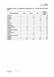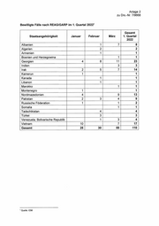 Anlage 2 zu Drs.-Nr. 7/9668 Bewilligte Fälle nach REAG/GARP im 1. Quartal 2022" Gesamt Staatsangehörigkeit Januar Februar März 1. Quartal 2022 Albanien 1 7 8 Algerien 2 2 Armenien 1 1 Bosnien und Herzegowina 1 1 Georgien 4 8 11 23 Indien 3 3 Irak 2 5 7 14 Kamerun 1 1 Kanada 1 1 Libanon 1 1 Marokko 1 1 Montenegro 1 1 Nordmazedonien 4 9 13 Pakistan 2 3 4 9 Russische Föderation 1 1 2 Somalia 1 1 Tadschikistan 4 4 Türkei 3 3 Venezuela, Bolivarische Republik 1 3 4 Vietnam 10 7 17 Gesamt 25 30 55 110 ! Quelle: IOM