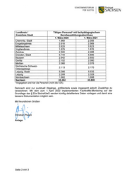 STAATSMlNlSTERlUM FÜR KULTUS ~ SACHSEN Landkreis/ Tätiges Personal* mit fachpädagogischem Kreisfreie Stadt Berufsausbildungsabschluss 1. März 2020 1. März 2021 Chemnitz, Stadt 1.969 2.008 Erzgebirgskreis 2.618 2.569 Mittelsachsen 2.633 2.623 Vogtland kreis 1.679 1.676 Zwickau 2.500 2.488 Dresden, Stadt 5.744 5.896 Bautzen 2.642 2.650 Görlitz 2.102 2.090 Meißen 2.066 2.076 Sächsische Schweiz- 2.113 2.170 Osterzgebirge LeipziQ, Stadt 5.386 5.535 LeipziQ 2.268 2.329 Nordsachsen 1.662 1.698 Sachsen 35.382 .. 35.808 * Angegeben sind hier die Personen (nicht die VZA) . Demnach sind nur punktuell Abgänge, größtenteils sowie insgesamt jedoch Zuwächse zu verzeichnen . Mit dem zum 1. April 2022 implementierten Fachkräfte-Monitoring auf der Grundlage des § 22a SächsKitaG werden künftig detailliertere Daten vorliegen und damit eine bessere Dokumentation möglich sein. Mit freundlichen Grüßen lf4~ Anlage Seite 3 von 3