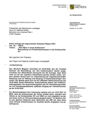 STAATSMINISTERIUM Freistaat DES INNERN SACHSEN Der Staatsminister SÄCHSISCHES STAATSMINISTERIUM DES INNERN Geschäftszeichen 01095 Dresden (bitte bei Antwort angeben) 3-1053/139/30 Präsidenten des Sächsischen Landtages Dresden, 20. Juni 2022 Herrn Dr. Matthias Rößler Bernhard-von-Lindenau-Platz 1 01067 Dresden Kleine Anfrage des Abgeordneten Sebastian Wippel (AfD) Drs.-Nr.: 7/9916 Thema: „Alter Wein in neuen Schläuchen“ Beschaffung von Polizeihubschraubern in der Endlosschlei- fe? Sehr geehrter Herr Präsident, den Fragen sind folgende Ausführungen vorangestellt: „Vorbemerkung: Das ‚Blaulicht Magazin‘ berichtete am 06.06.2020, das der Freistaat Sachsen die Beschaffung von drei Hubschraubern aktuell ausge- schrieben hat. Wesentlicher Kernpunkt war die Aussage, dass diese nicht nur für den regulären Polizeidienst genutzt werden sollen, son- dern darüber hinaus auch zur Unterstützung der Vegetationsbrandbe- kämpfung und zur Rettung und Bergung in katastrophenartigen Sze- narien. Der Beitrag deckt sich mit der offiziellen Bekanntmachung (am 20.05.2020) dieser öffentlichen Ausschreibung seitens des Polizeiver- waltungsamtes. Die Ausschreibungsform war ein Verhandlungsverfah- ren mit Teilnahmewettbewerb, spätester Eingang der Teilnehmeranträ- Hausanschrift: ge der 24.06.2020.' Sächsisches Staatsministerium des Innern Wilhelm-Buck-Str. 2 Der Ministerpräsident Herr Kretschmer äußerte sich am 16.07.2021 im 01097 Dresden MDR, dass die Hubschrauber der Polizei veraltet seien, nachdem eine Telefon +49 351 564-0 Offerte an die Bundesländer RP und NRW von dort abgelehnt wurde, Telefax +49 351 564-3199 weil diese nicht zur Personenrettung geeignet wären’. Im Weiteren teil- www.smi. sachsen.de te zum gleichen Zeitpunkt einer Sprecherin des SMI mit, dass diese Verkehrsanbindung: neue Technik (Hubschrauber) im Haushalt bereits eingeplant und ge- Zu erreichen mit den Straßenbahnli- nehmigt sei. nien 3, 6, 7,8, 13 Besucherparkplätze: Bitte beim Empfang Wilhelm-Buck- Str. 2 oder 4 melden.