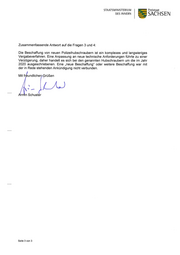 STAATSMINISTERIUM DES INNERN Freistaat SACHSEN Zusammenfassende Antwort auf die Fragen 3 und 4: Die Beschaffung von neuen Polizeihubschraubern ist ein komplexes und langwieriges Vergabeverfahren. Eine Anpassung an neue technische Anforderungen führte zu einer Verzögerung, daher handelt es sich bei den genannten Hubschraubern um die im Jahr 2020 ausgeschriebenen. Eine „neue Beschaffung“ oder weitere Beschaffung war mit der in Rede stehenden Ankündigung nicht verbunden. Mit freundlichen-Grüßen \ u: rmin Schuster Seite 3 von 3