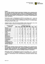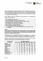 STAATSMINISTERIUM Freistaat DES INNERN SACHSEN Kreisfreie Stadt/ Straftatenobergruppe Landkreis 0000 | 1000 | 2000 | 3000 | 4000| 5000| 6000| 7000 Vogtlandkreis - 3 43 17 9 23 39 20 Zwickau 1 5 61 36 11 44 45 28 Freistaat Sachsen (einschließlich unbe- 8 152 1.478 1.325] 429|1.435| 955| 601 kannten Tatorten) Frage 2: Bei wie vielen polizeilich bekannt gewordenen Straftaten (ohne ausländerrechtli- che Verstöße) im 4. Quartal 2021 waren „Geduldete Ausländer“ als Täter beteiligt? (Bitte Aufschlüsseln nach Straftatbeständen; Landkreisen/Kreisfreien Städten und Beteiligung der „geduldeten Ausländer“ (kumulativ)!) Recherchiert wurde im Datenbestand der PKS für den Zeitraum vom 1. Januar bis 31. Dezember 2021 nach aufgeklärten Straftaten im Freistaat Sachsen, bei denen min- destens ein Tatverdächtiger mit dem Aufenthaltsanlass „Duldung (Abschiebungshinder- nisse nach Abschluss des Asylverfahrens)“ erfasst wurde. Insgesamt wurden 4.750 entsprechende Straftaten erfasst. Diese gliedern sich auf die Kreisfreien Städte/Landkreise und Straftatenobergruppen wie folgt auf: Kreisfreie Stadt/ Straftatenobergruppe Landkreis 0000 | 1000 | 2000 | 3000|4000 | 5000| 6000| 7000 Bautzen - 8 96 30 10 11 64 15 Chemnitz, Stadt - 12) 135| 108 91 73 91 97 Dresden, Stadt 2 27| 249| 217 76| 275| 204| 121 Erzgebirgskreis - 9 76 22 11 8 41 31 Görlitz 1 2 17 6 5 9 14 6 Leipzig - 8 67 19 3 40 47 9 Leipzig, Stadt 1 21| 308; 209) 151} 136) 192| 229 Meißen - - 23 12 9 42 23 13 Mittelsachsen - 2 53 19 11 30 22 28 Nordsachsen - 4 47 13 5 50 33 10 Sachsische Schweiz- 4 39 42 4 28 27 13 Osterzgebirge Vogtlandkreis - 12 87 37 6 51 50 32 Zwickau - 3 42 25 T 41 47 19 Freistaat Sachsen (einschließlich unbe- 4| 112 |1.240| 731| 389| 795| 856| 623 kannten Tatorten) Seite 3 von 6