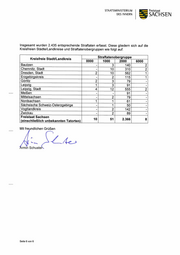 STAATSMINISTERIUM Freistaat DES INNERN SACHSEN Insgesamt wurden 2.435 entsprechende Straftaten erfasst. Diese gliedern sich auf die Kreisfreien Städte/Landkreise und Straftatenobergruppen wie folgt auf: ’ ‘ ? Straftatenobergruppe Kreisfreie Stadt/Landkreis 0000 1000 2000 6000 Bautzen - 3 140 2 Chemnitz, Stadt - 10 310 2 Dresden, Stadt 2 10 562 1 Erzgebirgskreis - 2 115 1 Görlitz 2 3 79 - Leipzig 1 3 91 - Leipzig, Stadt 4 12 555 2 Meißen - - 91 Mittelsachsen - 2 79 - Nordsachsen 1 1 61 - Sächsische Schweiz-Osterzgebirge - 1 50 - Vogtlandkreis - 2 142 - Zwickau - 2 89 - Freistaat Sachsen (einschließlich unbekannten Tatorten) 0 a zn . Mit freundlichen Grüßen u, AZ Aes rmin Schuste Seite 6 von 6