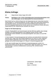 Sächsischer Landtag 7. Wahlperiode DRUCKSACHE 7/9887 Kleine Anfrage der Abgeordneten Juliane Nagel, DIE LINKE Thema: Nachfrage zu Drs 7/ 6716: Abschaffung des Vermummungsverbotes nach den Erfahrungen mit der Maskenpflicht bei Demonstrationen? Nach Antwort auf o.g. Kleine Anfrage kann die Staatsregierung den Unterschied zwischen Verstoß gegen § 17 Versammlungsgesetz und dem Tragen einer Mund-Nasen-Bedeckung nicht plausibel machen. So können auch Mund-Nasen-Bedeckungen theoretisch als Vermummungsgegenstände genutzt werden, genau wie zur klassischen Maske alternative Gegenstände für den Infektionsschutz intendiert sein können. Fragen an die Staatsregierung: 1.Hat die "Maskenpflicht" auf Versammlungen seit Mai 2020 dazu geführt, dass etwaige Straftaten und Ordnungswidrigkeiten nicht aufgeklärt werden konnten? (Bitte aufschlüsseln welche Straftaten und Ordnungswidrigkeiten nach Datum, Ort und PMK Zuordnung) 2. Worin besteht im Versammlungskontext der konkrete und strafrechtliche Unterschied zwischen dem Tragen einer Mund-Nasen-Bedeckung zum Schutz vor einer möglichen Corona-Infektion gegenüber einem Schal oder Tuch, welches über Mund und Nase getragen wird und als Verstoß gegen § 17 Absatz 2 Versammlungsgesetz gilt? 3. Wie viele Verstöße gegen das Sächsische Versammlungsgesetz wurden im 4. Quartal 2019 erfasst und wie viele im 1. Quartal 2022? (bitte nach Datum, Ort, Zahl der Tatverdächtigen, konkreter Straftatbestand, Zuordnung PMK, Verfahrensstand aufschlüsseln) Unterzeichner: Juliane Nagel Ort: Leipzig Datum: 17.05.2022 Eingegangen am: 17.05.2022