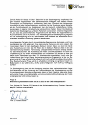STAATSMINISTERIUM Freistaat DES INNERN SACHSEN Gemäß Artikel 51 Absatz 1 Satz 1 SächsVerf ist die Staatsregierung verpflichtet, Fra- gen einzelner Abgeordneter oder parlamentarische Anfragen nach bestem Wissen unverzüglich und vollständig zu beantworten. Nach dem Grundsatz der Verfassungs- organtreue ist jedes Verfassungsorgan verpflichtet, bei der Ausübung seiner Befugnis- se den Funktionsbereich zu respektieren, den die hierdurch mitbetroffenen Verfas- sungsorgane in eigener Verantwortung wahrzunehmen haben. Dieser Grundsatz gilt zwischen der Staatsregierung und dem Parlament sowie seinen einzelnen Abgeordne- ten, so dass das parlamentarische Fragerecht durch die Pflicht der Abgeordneten zur Rücksichtnahme auf die Funktions- und Arbeitsfähigkeit der Staatsregierung begrenzt ist. Die Staatsregierung muss nur das mitteilen, was innerhalb der Antwortfrist mit zu- mutbarem Aufwand in Erfahrung gebracht werden kann. Im vorliegenden Fall wäre durch eine vollständige Beantwortung die Arbeits- und Funk- tionsfähigkeit der LDS gefährdet. Eine elektronische Recherche ist nicht möglich. Die notwendigen Daten für den abgefragten Zeitraum können daher nur durch die händi- sche Auswertung von mehr als 250 Akten der im Zeitraum Februar 2022 in der Auf- nahmeeinrichtung Dresden, Hammerweg untergebrachten Personen erlangt werden. Für das Heraussuchen, die Auswertung der Akten und Dokumentation im Sinne der Fragestellung ist von einem Arbeitsaufwand von mindestens 30 Minuten je Akte und damit einem Zeitaufwand von über 125 Arbeitsstunden auszugehen. Auch unter Be- rücksichtigung des hohen Rangs des parlamentarischen Fragerechts ist der zur Be- antwortung der Frage erforderliche Aufwand nicht mehr verhältnismäßig und zumutbar. Eine Beantwortung der Frage würde in erheblichem Umfang eine größere Anzahl von Bediensteten in der LDS binden, die für andere Tätigkeiten nicht mehr zur Verfügung stünden. Die Staatsregierung kam bei der Abwägung zwischen dem parlamentarischen Frage- recht einerseits und der Sicherung der Funktionsfähigkeit der Staatsregierung und der ihr nachgeordneten Behörden andererseits daher zu dem Ergebnis, dass eine Beant- wortung der Frage unverhältnismäßig und ohne erhebliche Einschränkung der Funkti- onsfähigkeit der LDS nicht zu leisten ist. Frage 5: Wie viele Asylbewerber waren am 28.02.2022 in der EAE untergebracht? Zum Stichtag 28. Februar 2022 waren in der Aufnahmeeinrichtung Dresden, Hammer- weg 88 Personen untergebracht. Mit es Grüßen y | fj f / P lan Roland Wöller Seite 4 von 4