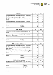 STAATSMINISTERIUM Freistaat DES INNERN SACHSEN PMK -links- EV TV Straftaten gegen die öffentliche Ordnung (§ 125a StGB) 1 - Straftaten gegen das Leben (§ 211 StGB) 2 - Straftaten gegen die persönliche Unversehrtheit (§ 224 4 _ StGB) Straftaten gegen die persönliche Freiheit (8 241 StGB) 1 1 davon geklärt 1 1 ungeklärt 4 - PMK -rechts- EV TV Gefahrdung des demokratischen Rechtsstaates (§ 86a StGB) 2 1 Straftaten gegen die öffentliche Ordnung (§ 130 StGB) a 2 Beleidigung (§ 188 StGB) 1 1 davon geklart 4 4 ungeklart 2 - PMK -ausländische Ideologie- EV TV Straftaten gegen die öffentliche Ordnung (8 129b StGB) 1 1 Straftaten gegen die persönliche Freiheit ($ 240 StGB, 2 _ $ 241 StGB) Alle übrigen strafrechtlichen Nebengesetze (Verstoß gegen das Vereinsgesetz, Verstoß gegen das Völkerstrafgesetz- 2 1 buch) davon geklärt 2 Zz ungeklart 3 - PMK -religiöse Ideologie- EV TV Straftaten gegen die öffentliche Ordnung (8 129b StGB) 2 2 davon geklärt 2 2 ungeklärt - - Seite 3 von 5