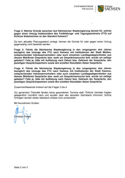STAATSMlNlSTERlUM FÜR KULTUS ~ SACHSEN Frage 2: Welche Gründe sprechen laut Sächsischer Staatsregierung derzeit für, welche gegen einen Umzug insbesondere des Fortbildungs- und Tagungszentrums (FTZ) auf Schloss Siebeneichen an den Standort Kamenz? Da kein aktueller Planungsstand vorliegt, können die Gründe für oder gegen einen Umzug gegenwärtig nicht bewertet werden. Frage 3: Führte die Sächsische Staatsregierung in den vergangenen drei Jahren bezüglich des Umzugs des FTZ nach Kamenz mit Institutionen der Stadt Meißen, entsprechenden Interessenvertretern oder auch einzelnen Landtagsabgeordneten aus diesem Wahlkreis Gespräche bzw. warb um Gesprächsersuche bzw. wurde um selbige gebeten? Falls ja, bitte mit Auflistung nach Datum bzw. Zeitraum der Gespräche, den jeweiligen Gesprächspartnern sowie den erzielten Resultaten dieser Gespräche. Frage 4: Führte die Sächsische Staatsregierung in den vergangenen drei Jahren bezüglich des Umzugs des FTZ nach Kamenz mit Institutionen der Stadt Kamenz, entsprechenden Interessenvertretern oder auch einzelnen Landtagsabgeordneten aus diesem Wahlkreis Gespräche bzw. warb um Gesprächsersuche bzw. wurde um selbige gebeten? Falls ja, bitte mit Auflistung nach Datum bzw. Zeitraum der Gespräche, den jeweiligen Gesprächspartnern sowie den erzielten Resultaten dieser Gespräche. zusammenfassende Antwort auf die Fragen 3 bis 4: Zur genannten Thematik fanden keine gesonderten Termine statt. Örtliche Vertreter fragten gelegentlich mündlich nach und wurden über den aktuellen Sachstand informiert. Solche Anfragen werden weder statistisch erfasst noch protokolliert. Mit freundlichen Grüßen ( Seite 2 von 2