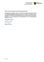 STAATSMINISTERIUM Freistaat FÜR WISSENSCHAFT SACH SEIN KULTUR UND TOURISMUS Frage 4: Ist einen Erweiterung des Studienganges geplant? Die Frage wird so verstanden, dass m\i„Erweiterung des Studienganges"eine Erhöhung der Studienplatzkapazitäten gemeint ist. Hierzu zieht SMWK in Erwägung, auf der Grundlage einer substantiierten Bedarfsermittlung und in Abstimmung mit dem Staats ministerium für Soziales und Gesellschaftlichen Zusammenhalt eventuelle Handlungs spielräume für eine Aufstockung der Studienplatzzahlen ab dem Doppelhaushalt 2025/2026 zu prüfen. Mit freundlichen Grüßen Sebastian Gemkow Seite 2 von 2