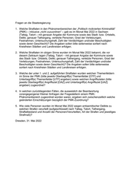 Fragen an die Staatsregierung: 1. Welche Straftaten in den Phänomenbereichen der „Politisch motivierten Kriminalität“ (PMK) – inklusive „nicht zuzuordnen“ – gab es im Monat Mai 2022 in Sachsen (Tattag, Tatort – mit genauer Angabe der Kommune sowie des Stadt- bzw. Ortsteils, Delikt, genauer Tathergang, verletzte Personen, Grad der Verletzungen, Festnahmen, Untersuchungshaft, Zahl der Verdächtigen und/oder Beschuldigten sowie deren Geschlecht)? Die Angaben sollen bitte seitenweise sortiert nach Kreisfreien Städten und Landkreisen erfolgen. 2. Welche Straftaten im obigen Sinne wurden im Monat Mai 2022 bekannt, die vor diesem Zeitraum lagen (Tattag, Tatort – mit genauer Angabe der Kommune sowie des Stadt- bzw. Ortsteils, Delikt, genauer Tathergang, verletzte Personen, Grad der Verletzungen, Festnahmen, Untersuchungshaft, Zahl der Verdächtigen und/oder Beschuldigten sowie deren Geschlecht)? Die Angaben sollen bitte seitenweise sortiert nach Kreisfreien Städten und Landkreisen erfolgen. 3. Welche der unter 1. und 2. aufgeführten Straftaten wurden welchen Themenfeldern im Sinne der PMK (bitte jeweils Oberbegriff(e) Themenfelder [OTF] und Unterbegriff(e) Themenfelder [UTF] angeben) sowie welchen Angriffszielen (bitte jeweils Oberbegriff(e) Angriffsziel [OAZ] und Unterbegriff(e) Angriffsziel [UAZ] angeben) zugeordnet? 4. In welchen zurückliegenden Fällen, die ausweislich der Beantwortung vorangegangener Kleiner Anfragen der Fragestellerin einem PMK- Phänomenbereich zugeordnet worden waren, ergaben sich zwischenzeitlich welche geänderten Einschätzungen bezüglich der PMK-Zuordnung? 5. Wie viele Personen wurden im Monat Mai 2022 wegen antisemitischer Delikte zu welchen Strafen verurteilt (aufgeschlüsselt nach Tattag, Tatort, Tathergang, Straftatbestand und Anzahl der Personen/Verurteilten, Art der Strafen und jeweiliges Strafmaß)? Dresden, 31. Mai 2022