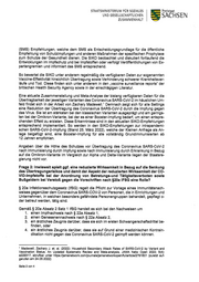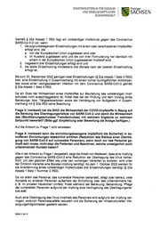 STAATS1v11N1STER1UM FÜR SOZ1ALES Freistaat UND GESELLSCHAFTLICHEN SACHSEN ZUSAMMENHALT Gem äß § 22a Absatz 1 IfSG liegt ein vollständiger lm pfschutz gegen das Coronavirus SARS-Co-V-2 vor, wenn 1. die zugrundeliegenden Einzelim pfungen m it einem oder verschiedenen lm pfstoffen e r f o lg t s ind , d ie a. von der Europäischen Union zugelassen sind oder b. im Ausland zugelassen sind und die von ihrer Form ulierung her identisch m it einem in der Europäischen Union zugelassenen lm pfstoff sind, 2. insgesam t drei Einzelim pfungen erfolgt sind und 3. die letzte Einzelim pfung m indestens drei Monate nach der zweiten Einzelim pfung e r f o lg t is t . Bis zum 30. Septem ber 2022 genügen zwei Einzelim pfungen (§ 22a Absatz 1 Satz 3 IfSG) bzw. eine Einzelim pfung in Zusam m enhang m it einem vorher durchgeführten Antik örper- test sowie einer nachgewiesenen Infek tion m it dem Coronavirus SARS-CoV-2 gem äß § 22a Absatz 1 Satz 4 USG. Da ein Grad der W irk sam k eit eines lm pfstoffes zur Beurteilung des vollständigen Im pf- schutzes nicht ausschlaggebend ist, findet dies bei der Prüfung und dem Vollzug eines Betretungs- bzw. Tätigk eitsverboten sowie der Verhängung von Bußgeldern in Zusam - m enhang m it § 20a IfSG k eine Beachtung. Fr a g e 3: In w i ew ei t h a t d i e SIK O d i e W i r k s a m k ei t d er COVID-Im p f s t o f f e i n B ezu g a u f d ie Senk ung d es Üb er t r ag ung sr isik o s vo n SARS-Co V-2 und d am it d ie Wir k sam k eit d es (B evö l k er u n g s s c h u t zes / Fr em d s c h u t zes ) m i t w el c h em Er g eb n i s zu w el c h em Zeit p unk t b ew er t et ? (B it t e g g f . Em p f ehlung o d er B ew er t ung als Anlag e b eif ü g en.) Auf die Antwort zu Frage 1 wird verwiesen. Fr a g e 4: In w i ew ei t k a n n d i e ei n r i c h t u n g s b ezo g en e Im p f p f l i c h t d i e Si c h er h ei t i n b e- t r o f f enen Einr ic ht ung en t at säc hlic h er hö hen (Red uk t io n d es Risik o s einer Üb er t r a- g ung vo n SARS-Co V-2 auf vulner ab le Per so nen), w enn d o c h nur d as Per so nal g e- im p f t sein m uss, nic ht ab er d ie Pat ient en und B ew o hner , w elc he unw eig er lic h auc h unt er einand er K o nt ak t hab en? W ie in d e r Ant wo r t zu F r a g e 1 d a r g e s t e llt , ze ig t d ie Ar b e it vo n Ma d e we ll, d a s s e ine lm p f ung gegen das Coronavirus SARS-CoV-2 eine Reduk tion der Übertragung des Virus herbei- führt. Um den gleichen Effek t wie unter den vorherigen Varianten zu erzielen, wird unter der Om ik ron-Variante eine Booster-lm pfung benötigt. Ab dem 1. Ok tober 2022 werden für die Anerk ennung eines vollständigen lm pfschutzes drei Einzelim pfungen benötigt (§ 22a Absatz 1 Satz 1 Num m er 2 IfSG). Da vor allem das Personal, das vulnerable Personen behandelt, pflegt oder betreut, viele Kontak te zu anderen Personen außerhalb der Einrichtung oder des Unternehm ens hat, z. B. im privaten häuslichen Um feld, findet während der Betreuung, Behandlung, Pflege der vulnerablen Personen aufgrund der lm pfung eine Verringerung des Übertragungsrisi- kos statt. Auch eine Übertragung des Virus innerhalb des Personals wird aufgrund der lm pfung ver- ringert, wodurch Personalausfälle reduziert und die Sicherung der infrastruk turellen Ver- sorgungsm öglichk eiten gestärk t werden. Seite 3 von 4