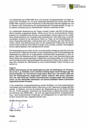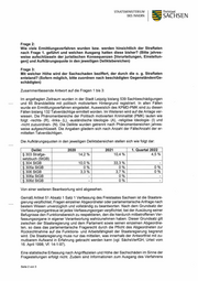 Freistaat = SACHSEN STAATSMINISTERIUM DES INNERN nicht Bestandteil des KPMD-PMK beim LKA Sachsen (Eingangsstatistik) und liegen in- soweit nicht unmittelbar vor. Für eine vollständige Beantwortung müsste jeder Fall des KPMD-PMK zunächst mit dem Polizeilichen Auskunftssystem Sachsen abgeglichen und im Weiteren unter Einbeziehung der sachbearbeitenden Polizeidienststelle und ggf. un- ter weiterer Einbeziehung der Justizbehörden händisch aufbereitet werden. Zur vollständigen Beantwortung der Fragen müssten insofern alle 604 Ermittlungsver- fahren händisch ausgewertet werden. Hierfür ist pro Fall ein durchschnittlicher Arbeits- aufwand von mindestens einer Stunde zu veranschlagen. Hieraus ergibt sich ein zusätz- licher Gesamtaufwand von mindestens 604 Arbeitsstunden. Dies hätte einen unverhält- nismäßigen Aufwand für die sächsische Polizei zur Folge, der die Arbeitsfähigkeit ein- zelner Organisationseinheiten, insbesondere beim LKA Sachsen, ggf. über Wochen be- hindern würde. Eine Beantwortung wäre mit den bestehenden Ressourcen der sächsi- schen Polizei im Rahmen einer Kleinen Anfrage nicht zumutbar zu leisten. Kernaufgaben können währenddessen nicht wahrgenommen werden. Die Staatsregierung kam daher bei der vorzunehmenden Abwägung zwischen dem par- lamentarischen Fragerecht einerseits und der Gewährleistung der Funktionsfähigkeit der Staatsregierung sowie der ihr zugeordneten Polizeibehörden andererseits zu dem Er- gebnis, dass eine Beantwortung der Fragestellungen auch unter Berücksichtigung des hohen Rangs des parlamentarischen Fragerechts unverhältnismäßig und ohne erhebli- che Einschränkung der Funktionsfähigkeit der sächsischen Polizei nicht zu leisten ist und dass dem Interesse der Öffentlichkeit an einer funktionsfähigen Polizei Vorrang zu ge- währen ist. Frage 4: Welche Erkenntnisse hat die Staatsregierung über die Beteiligung von Extremis- ten an den o. g. Straftaten und in welchem Umfang liegen darauf bezogen ggf. Be- kennerschreiben vor und welchen Inhalt haben diese bzw. wie werden diese sei- tens der Staatsregierung eingeordnet? (Sofern bekannt, bitte genau aufschlüs- seln, wie viele Personen, welcher extremistischen Gruppierungen oder Einzelper- sonen, an den Übergriffen teilnahmen und welche Straftaten diesen Extremisten zugeordnet werden konnten) In der polizeilichen Vorgangsbearbeitung werden Straftaten und Ordnungswidrigkeiten nicht gezielt nach Extremisten erfasst. Daher kann zu der Frage keine Aussage getroffen werden. Im Weiteren wird auf die Antwort der Staatsregierung auf die Kleine Anfrage Drs.-Nr. 7/7322 verwiesen. Hinsichtlich der Erkenntnisse zu Bekennerschreiben sehen die Richtlinien des KPMD-PMK - wie auch die allgemeinpolizeiliche Vorgangsbearbei- tung — keine entsprechenden Erfassungs- und Abfragewerte vor, so dass dies nicht ge- sondert recherchiert bzw. dargestellt werden kann. Mit ffeundlichen Grüßen rmin Schuster Anlage Seite 3 von 3