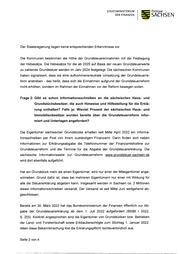 ~SAC'HsEN STAATSMlNlSTERlUM DER FINANZEN Der Staatsregierung liegen keine entsprechenden Erkenntnisse vor. Die Kommunen bestimmen die Höhe der Grundsteuereinnahmen mit der Festlegung der Hebesätze. Die Hebesätze für die ab 2025 auf Basis der neuen Grundsteuerwerte zu zahlende Grundsteuer werden im Jahr 2024 festgelegt. Die sächsischen Kommunen haben signalisiert, dass sie eine aufkommensneutrale Umsetzung der Grundsteuerre- form anstreben - das heißt, dass sich die Einnahmen aufgrund der Grundsteuerreform nicht erhöhen, sondern im Rahmen der Einnahmen vor der Reform bewegen sollen . Frage 2: Gibt es schon Informationsschreiben an die sächsischen Haus- und Grundstücksbesitzer, die auch Hinweise und Hilfestellung für die Erklä- rung enthalten? Falls ja: Wieviel Prozent der sächsischen Haus- und Immobilienbesitzer wurden bereits über die Grundsteuerreform infor- miert und Unterlagen angefordert? Die Eigentümer sächsischer Grundstücke erhalten seit Mitte April 2022 ein Informa- tionsschreiben per Post von ihrem zuständigen Finanzamt. Darin finden sich neben Informationen zur Erklärungsabgabe die Telefonnummer der Finanzamtshotline zur Grundsteuerreform und die Termine für die Abgabe der Grundsteuererklärung. Die sächsische Informationsseite zur Grundsteuerreform www.grundsteuer.sachsen .de wird dort ebenfalls aufgeführt. Hat ein Grundstück mehr als einen Eigentümer, wird nur einer der Miteigentümer ange- schrieben. Grund dafür ist, dass bei mehreren Eigentümern nur einer mit Wirkung für alle die Steuererklärung abgeben kann. Insgesamt werden in Sachsen ca. 2 Millionen dieser Informationsschreiben versandt. Der Versand ist seit Mitte Juni weitgehend ab- geschlossen. Bereits am 30. März 2022 hat das Bundesministerium der Finanzen öffentlich zur Ab- gabe der Grundsteuererklärung ab dem 1. Juli 2022 aufgefordert (BStBI 1 2022, S. 205). Konkret angesprochen sind die Eigentümer von Grundstücken bzw. Betrieben der Land- und Forstwirtschaft sowie Erbbauberechtigte zum Stichtag 1. Januar 2022. Allein diese Bekanntmachung löst die Erklärungspflicht rechtsverbindlich aus. Seite 2 von 4