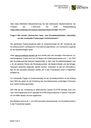 STAATSMlNlSTERlUM DER FINANZEN ljSACHsEN Über diese öffentliche Bekanntmachung hat das Sächsische Staatsministerium der Finanzen am 1. April 2022 mit einer Pressemitteilung (https://www.medienservice.sachsen.de/medien/news/1041606) informiert. Frage 3: Wie werden sächsischen Haus- und Grundstücksbesitzer unterstützt, um den eventuellen Forderungen nachzukommen? Die sächsische Finanzverwaltung stellt im Zusammenhang mit der Umsetzung der Grundsteuerreform umfangreiche Informationsmöglichkeiten und individuelle Angebote für die steuerpflichtigen bereit: Unter www.grundsteuer.sachsen.de sind bereits jetzt alle wichtigen Informationen zu- sammengefasst. Zudem wird dort mit Beginn der Erklärungsannahme zum 1. Juli 2022 das Grundsteuerportal Sachsen freigeschaltet, in dem viele Grundstücksangaben (wie z. B. die amtliche Fläche, die Flurstücksnummer, der Bodenrichtwert und die Ertrags- messzahl) kostenfrei abgerufen werden können . Außerdem ist dort ein Informations- flyer für den schnellen Überblick verlinkt, der in den Finanzämtern auch in Papierform erhältlich ist. Für individuelle Fragen im Zusammenhang mit der Grundsteuerreform ist seit Anfang April 2022 bei jedem für die Ermittlung des Grundsteuerwerts zuständigen Finanzamt eine Telefon-Hotline geschaltet. Wer Hilfe bei der Anmeldung im elektronischen System ELSTER benötigt, kann sich nach Terminabsprache durch spezielle ELSTER-Ansprechpartner in seinem Finanzamt vor Ort helfen lassen und sich registrieren . Des Weiteren wird es ab 1. Juli 2022 besondere Sprechstunden zur Grundsteuerreform in den Finanzämtern geben . Seite 3 von 4