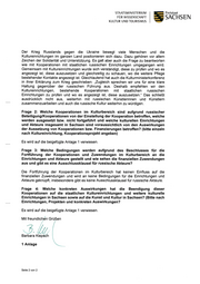 STAATSMINISTERIUM Freistaat FÜR WISSENSCHAFT SACHSEN KULTUR UND TOURISMUS Der Krieg Russlands gegen die Ukraine bewegt viele Menschen und die Kultureinrichtungen im ganzen Land positionieren sich dazu. Dazu gehören vor allem Zeichen der Solidarität und Unterstützung. Es galt aber auch die Frage zu beantworten wie mit Kooperationen mit staatlichen russischen Einrichtungen umgegangen wird. Gemeinsam mit Kultureinrichtungen wurde sich verständigt, diese zu prüfen und wo es angezeigt ist, diese auszusetzen und gleichzeitig zu schauen, wo die weitere Pflege bestehender Kontakte angezeigt ist. Gleichlautend hat auch die Kulturministerkonferenz in ihrer Erklärung zum Krieg geschrieben: „Zugleich sprechen wir uns für eine klare Haltung gegenüber der russischen Führung aus. Deshalb empfehlen wir den Kultureinrichtungen, bestehende Kooperationen mit staatlichen russischen Einrichtungen zu prüfen und wo es angezeigt ist, diese auszusetzen." Das schließt ausdrücklich nicht aus, weiterhin mit russischen Künstlerinnen und Künstlern zusammenzuarbeiten und auch die russische Kultur weiterhin zu würdigen. Frage 2: Welche Kooperationen Im Kulturbereich sind aufgrund russischer Beteiligung/Kooperationen von der Einstellung der Kooperation betroffen, welche werden ausgesetzt bzw. nicht fortgeführt und welche kulturellen Einrichtungen und Akteure insgesamt in Sachsen sind voraussichtlich von den Auswirkungen der Aussetzung von Kooperationen bzw. Finanzierungen betroffen? (bitte einzeln nach Kultureinrichtung, Kooperationsprojekt angeben) Es wird auf die beigefügte Anlage 1 verwiesen. Frage 3: Welche Bedingungen werden aufgrund des Beschlusses für die Fortführung der Kooperationen und Zuwendungen im Kulturbereich an die Einrichtungen und Akteure gestellt und wie sehen die finanziellen Zuwendungen aus und gibt es eine Ausschlussklausel für russische Akteure? Die Fortführung der Kooperationen im Kulturbereich hat keinen Einfluss auf die finanziellen Zuwendungen und wird an keine Bedingungen für die Einrichtungen und Akteure geknüpft, insbesondere gibt es keine Ausschlussklausel für russische Akteure. Frage 4: Welche konkreten Auswirkungen hat die Beendigung dieser Kooperationen auf die staatlichen Kultureinrichtungen und weitere kulturelle Einrichtungen in Sachsen sowie auf die Kunst und Kultur in Sachsen?(Bitte nach Einrichtungen, Projekten und konkreten Auswirkungen? Es wird auf die beigefügte Anlage 1 venwiesen. Mit freundlichen Grüßen Barbara Klepsch 1 Anlage Seite 2 von 2