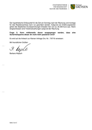 Der hypothetische Erlösausfall für die Zeit am Sonntag nach der Räumung und montags für das Residenzschloss kann nur geschätzt werden. Aufgrund von Erfahrungswerten gehen die Staatlichen Kunstsammlungen Dresden hier von ca. 20.300 Euro aus. Hierin eingeschlossen sind Ticketrückzahlungen aufgrund der Räumung. Frage 5: Kann mittlerweile davon ausgegangen werden, dass eine Sicherheitspanne dieser Art nicht mehr passieren wird? Es wird auf die Antwort zur Kleinen Anfrage Drs.-Nr.: 7/9716 verwiesen. Mit freundlichen Grüßen Barbara Klepsch Seite 2 von 2