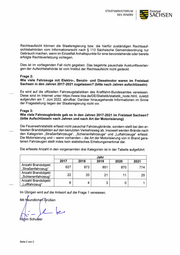 Sis SACHSEN STAATSMINISTERIUM Freistaat DES INNERN Rechtsaufsicht können die Staatsregierung bzw. die hierfür zuständigen Rechtsauf- sichtsbehörden vom Informationsrecht nach § 113 Sächsische Gemeindeordnung nur Gebrauch machen, wenn im Einzelfall Anhaltspunkte für eine bevorstehende oder bereits erfolgte Rechtsverletzung vorliegen. Dies ist im vorliegenden Fall nicht gegeben. Das begehrte pauschale Auskunftsverlan- gen der Aufsichtsbehörde ist vom Institut der Rechtsaufsicht nicht gedeckt. Frage 2: Wie viele Fahrzeuge mit Elektro-, Benzin- und Dieselmotor waren im Freistaat Sachsen in den Jahren 2017-2021 zugelassen? (bitte nach Jahren aufschlüsseln) Es wird auf die offiziellen Fahrzeugstatistiken des Kraftfahrt-Bundesamtes verwiesen. Diese sind im Internet unter https://www.kba.de/DE/Statistik/statistik_node.html, zuletzt aufgerufen am 7. Juni 2022, abrufbar. Darüber hinausgehende Informationen im Sinne der Fragestellung liegen der Staatsregierung nicht vor. Frage 3: Wie viele Fahrzeugbrände gab es in den Jahren 2017-2021 im Freistaat Sachsen? (bitte Aufschlüsseln nach Jahren und nach Art der Motorisierung) Die Feuerwehrstatistik erfasst nicht pauschal Fahrzeugbrände, sondern stellt bei den er- fassten Brandobjekten auf den benutzten Verkehrsweg ab. Insoweit werden Brände nach den Kategorien „Straßenfahrzeuge“, „Schienenfahrzeuge“ und „Luftahrzeuge“ erfasst. Die Motorisierung und — wenn vorhanden - die Art der Motorisierung von in Brand gera- tenen Fahrzeugen stellt indes kein statistisches Erhebungsmerkmal dar. Die erfasste Anzahl in den vorgenannten drei Kategorien ist in der Tabelle aufgeführt: Jahr 2017 2018 2019 2020 2021 Anzanl Brandenjekt „Straßenfahrzeug 627 873 851 870 774 Anzahl Brandobjekt 92 20 21 11 95 „Schienenfahrzeug Anzahl Brandobjekt „Luftfahrzeug“ 6 4 a 0 y Im Ubrigen wird auf die Antwort auf die Frage 1 verwiesen. Mit fyeundlich rüßen NL te in Schuster Seite 2 von 2