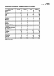 Anlage 2 zu Drs.-Nr. 7/9603 Zugewiesene Asylbewerber nach Nationalitäten 1. Quartal 2022 Nationalität Januar Februar März Gesamt Afghanistan 2 7 4 13 Eritrea 3 3 Georgien 21 5 6 32 Irak 7 9 23 39 Iran 1 1 2 Jemen 4 4 Kamerun 2 1 1 4 Kosovo 1 1 Libanon 1 6 1 8 Libyen 2 2 Marokko 1 1 Nordmazedonien 1 1 Pakistan 2 2 Russische Föderation 1 1 Saudi-Arabien 1 1 Syrien 32 32 25 89 Tunesien 3 1 4 Türkei 1 1 3 5 Ungeklärt 1 1 Venezuela 6 11 19 36 Vietnam 1 3 4 Summe 80 80 93 253 Stand: 20.04.2022