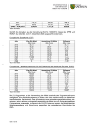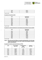2021 115,33 283,52 -168,19 2022 36,12 *57,12 -21,00 EFRE + REACT-EU 2.240,47 1.311,08 929,39 *Stand 30.04.2022 Gemäß den Vorgaben aus der Verordnung (EU) Nr. 1303/2013 müssen die EFRE und REACT-EU-Mittel bis zum 31. Dezember 2023 ausgezahlt worden sein. Europäischer Sozialfonds (ESF) Jahr Plan EU-Mittel Auszahlung EU Mittel Differenz (Mio. Euro) (Mio. Euro) (Mio. Euro) 2014 89,14 0 89,14 2015 90,92 28,97 61,95 2016 92,74 63,80 28,94 2017 94,60 89,66 4,93 2018 96,49 106,04 -9,55 2019 98,42 108,30 -9,88 2020 110,99 97,45 13,54 2021 16,00 80,47 -64,47 2022 0 *11,51 -11,51 *Stand 30.04.2022 Europäischer Landwirtschaftsfonds für die Entwicklung des ländlichen Raumes (ELER) Jahr Plan EU-Mittel Auszahlung EU Mittel Differenz (Mio. Euro) (Mio. Euro) (Mio. Euro) 2014 120,20 12,87 107,33 2015 120,01 22,45 97,56 2016 128,39 55,66 72,73 2017 128,14 80,31 47,83 2018 127,78 103,53 24,25 2019 127,42 125,82 1,60 2020 127,04 147,54 - 20,5 2021 157,75 153,78 3,97 2022 158,30 * 18,33 139,97 *Stand 30.04.2022 Bei EU-Programmen ist die Verwendung der Mittel innerhalb des Programmzeitraums maßgeblich. Eine Nichtverausgabung in einem Jahr führt insofern nicht zum Verfall der Haushaltsmittel. Es lässt sich zwar grundsätzlich eine jahresbezogene Betrachtung vor- nehmen, jedoch können und werden regelmäßig die Mittel bis zum Ende der jeweiligen Förderperiode verausgabt. Im Bereich der ELER-Förderung besteht die Möglichkeit der Mittelverausgabung und Abrechnung gegenüber der europäischen Kommission bis 2025. Seite 4 von 6