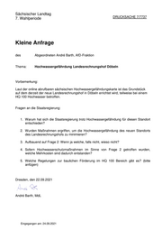 Sächsischer Landtag 7. Wahlperiode DRUCKSACHE 7/7737 Kleine Anfrage des Abgeordneten André Barth, AfD-Fraktion Thema: Hochwassergefährdung Landesrechnungshof Döbeln Vorbemerkung: Laut der online abrufbaren sächsischen Hochwassergefährdungskarte ist das Grundstück auf dem derzeit der neue Landesrechnungshof in Döbeln errichtet wird, teilweise bei einem HQ 100 Hochwasser betroffen. Fragen an die Staatsregierung: 1. Warum hat sich die Staatsregierung trotz Hochwassergefährdung für diesen Standort entschieden? 2. Wurden Maßnahmen ergriffen, um die Hochwassergefährdung des neuen Standorts des Landesrechnungshofs zu minimieren? 3. Aufbauend auf Frage 2: Wenn ja welche, falls nicht, wieso nicht? 4. Sofern Hochwasserschutzmaßnahmen im Sinne von Frage 2 getroffen wurden, welche Mehrkosten sind dadurch entstanden? 5. Welche Regelungen zur baulichen Förderung im HQ 100 Bereich gibt es? (bitte anfügen) Dresden, den 22.09.2021 André Barth, MdL Eingegangen am: 24.09.2021