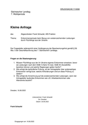 DRUCKSACHE 7/10090 Sächsischer Landtag 7. Wahlperiode Kleine Anfrage des Abgeordneten Frank Schaufel, AfD-Fraktion Thema: Einkommenseinsatz beim Bezug von existenzsichernden Leistungen durch Flüchtlinge aus der Ukraine Der Fragesteller widerspricht einer Verlängerung der Beantwortungsfrist gemäß § 56 Abs. 5 der Geschäftsordnung des 7. Sächsischen Landtags. Fragen an die Staatsregierung: 1. Müssen Flüchtlinge aus der ihr Ukraine eigenes Einkommen einsetzen, bevor sie Leistungen nach dem SGB II (Hartz IV) bzw. SGB XII (Sozialhilfe) beziehen können und welche Regelungen gelten hierfür? 2. Wie erfolgt die behördliche Prüfung, ob der Antragsteller über anderweitiges Einkommen verfügt bzw. welche Anforderungen sind an diese Prüfung zu stellen? 3. Wie erfolgt die Anrechnung auf die existenzsichernden Leistungen, wenn der Antragsteller laufendes Einkommen wie z.B. Arbeitseinkommen oder Altersrente bezieht? Dresden, 16.06.2022 Unterzeichner: Frank Schaufel Ort: Dresden Datum: 16.06.2022 Frank Schaufel Eingegangen am: 16.06.2022
